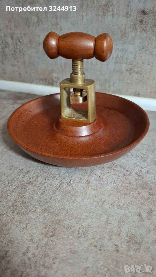 Ръчно изработена купа за чупене на орехи и лешници с вградена винтова преса. Дизайн: Включва дървена купа изработена от масивно дърво тик и месингов механизъм за винтово чупене в центъра. Функционалност: Уредът използва винт за прилагане на натиск върху черупката. Размери виж снимките. Изпращам с ЕКОНТ преглед и тест. Моля разгледайте и другите ми предложения.