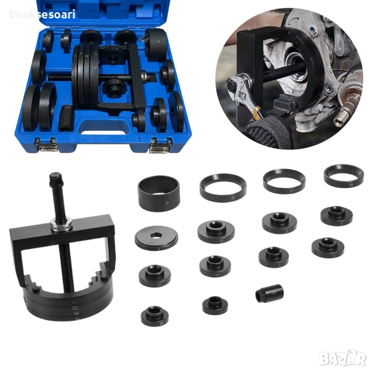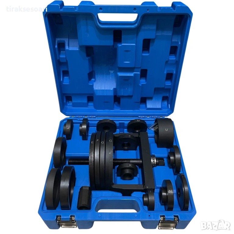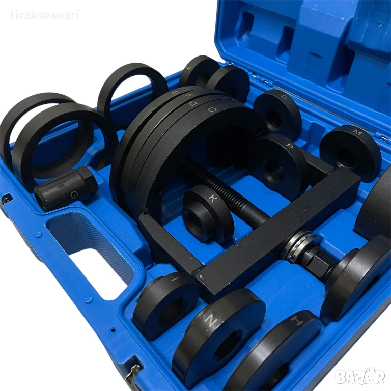 Комплектът включва широка гама притискащи плочи и адаптери, които позволяват работа с различни размери лагери. Благодарение на центриращото устройство, винтът остава винаги в правилна позиция, което осигурява прецизност, стабилност и безопасност при работа.