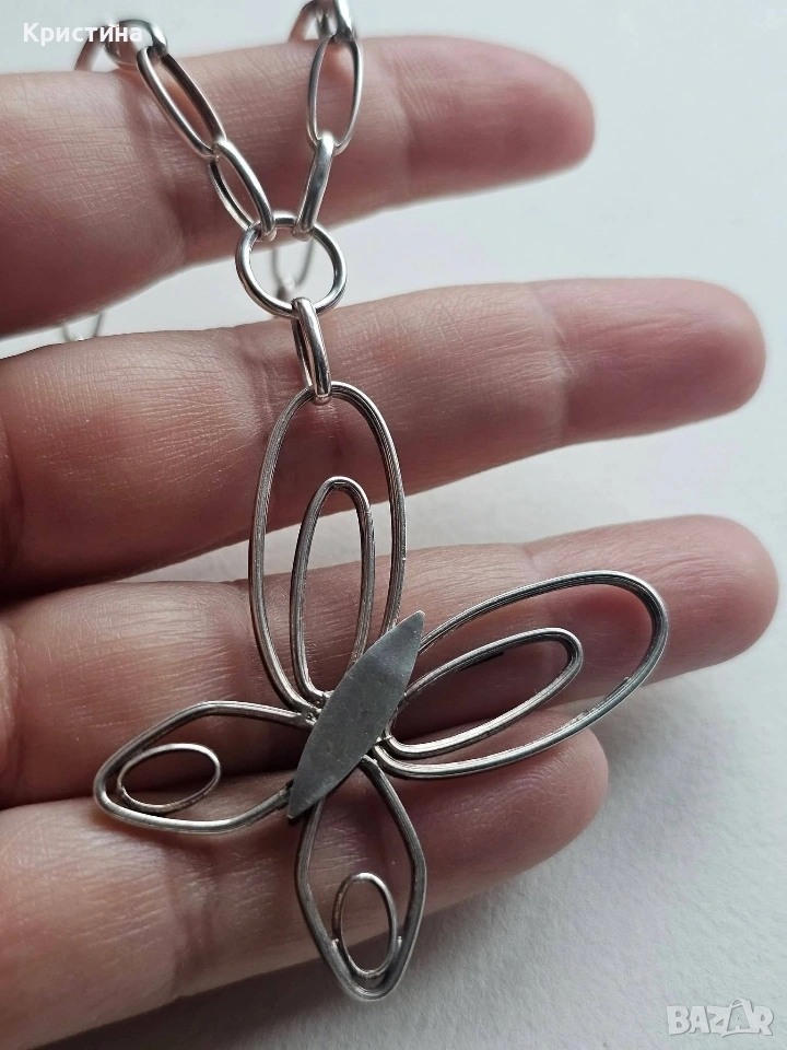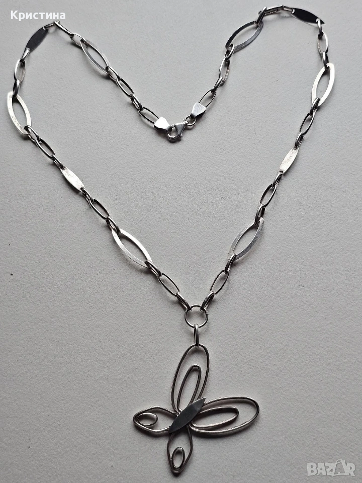 Красиво сребърно колие с пеперуда. Проба: 925. Тегло: 12 гр. Дължина: 50 см. + 6 см. на висящата част.