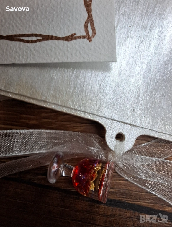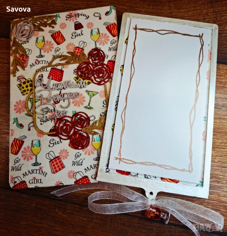 Материали: дървена основа, хартия за декупаж, акрилни бои металик, бирен картон, акварелен картон, сатенена панделка, мини чаша за декорация