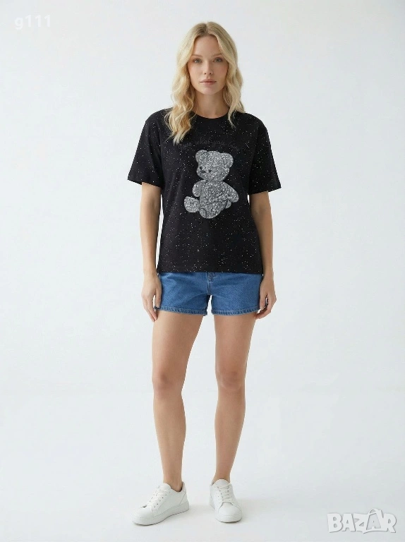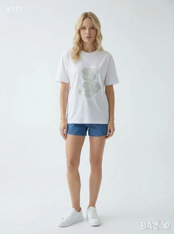 Нови памучни тениски с мече от пайети и напръскан сребърен ефект