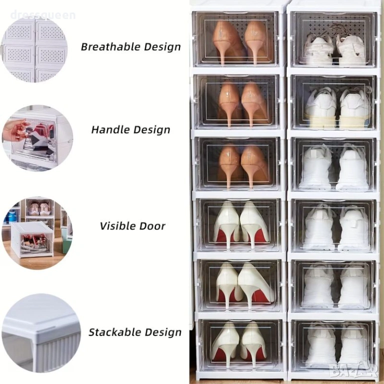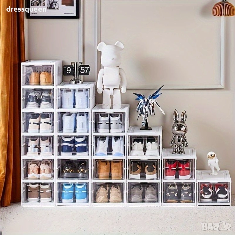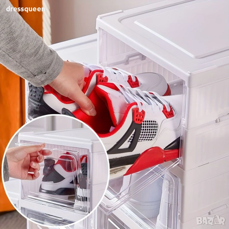 Оптимизирайте пространството в своя дом с професионалния сгъваем органайзер на 3 нива. Този модул е специално проектиран за хора, които ценят реда и модерния интериор. Благодарение на прозрачните панели и изчистения дизайн, кутиите изглеждат като стилна витрина, като същевременно спестяват ценно място чрез вертикално подреждане. Водоустойчивият материал позволява съхранение на всякакъв вид обувки – от ежедневни маратонки до официални токчета. Твърдата структура предотвратява деформацията на обувките и позволява подреждането на няколко модула един върху друг за изграждане на цяла стена от органайзери.