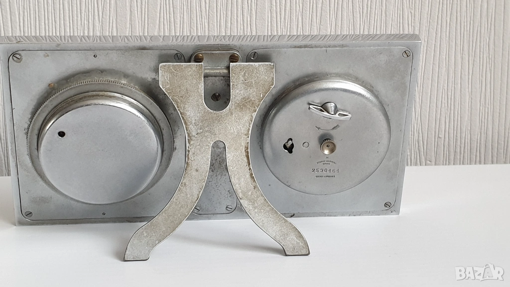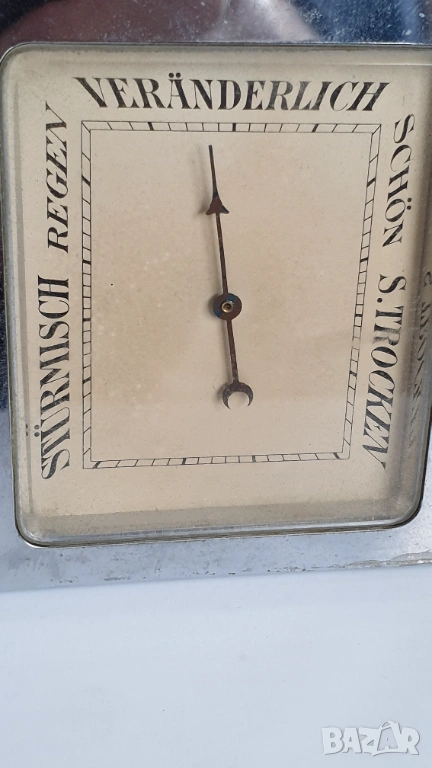 Комплект за бюро от началото на 20-ти век, състоящ се от часовник и съответстващ барометър, поставени в стойка с термометър.Всички уреди работят,размери 16/8см.