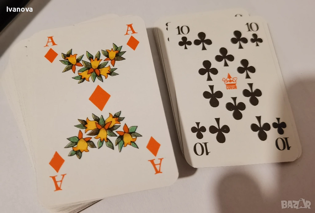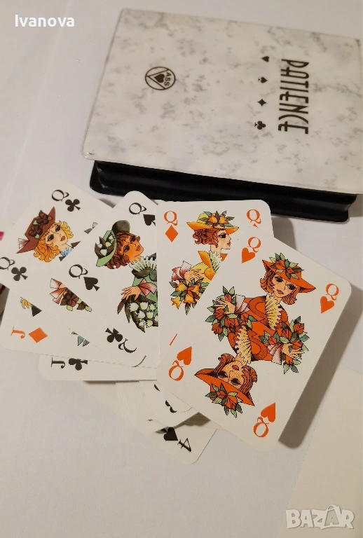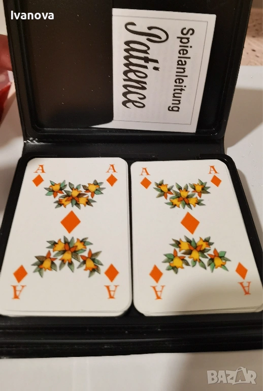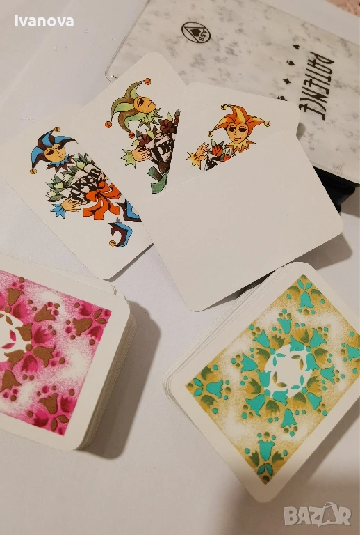 Мини карти за пасианс, белот и др от времето на ГДР с много красиви рисунки. 2 пълни тестета от по 52 карти, 3 жокера и 1 празна - резервна карта.