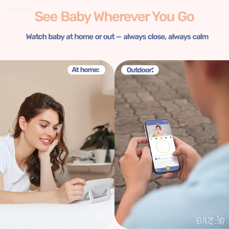 Двойна връзка: Може да гледате бебето на включения 4-инчов IPS дисплей (директна връзка без нужда от интернет) ИЛИ през мобилно приложение на телефона си (чрез Wi-Fi).