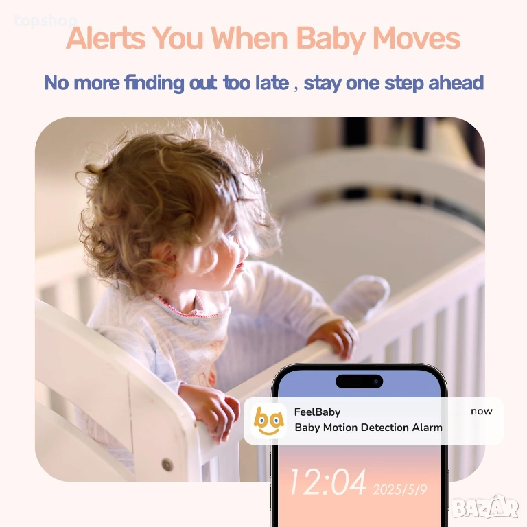 Интелигентни известия: Датчик за движение и детектор за плач. Получавате незабавни съобщения на телефона и екрана.