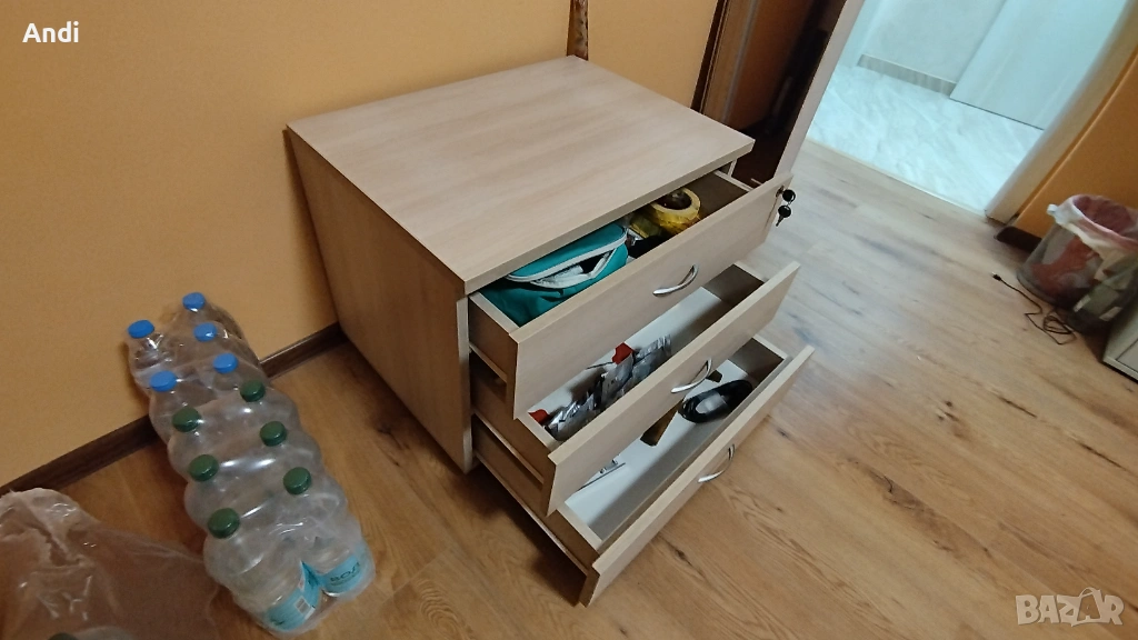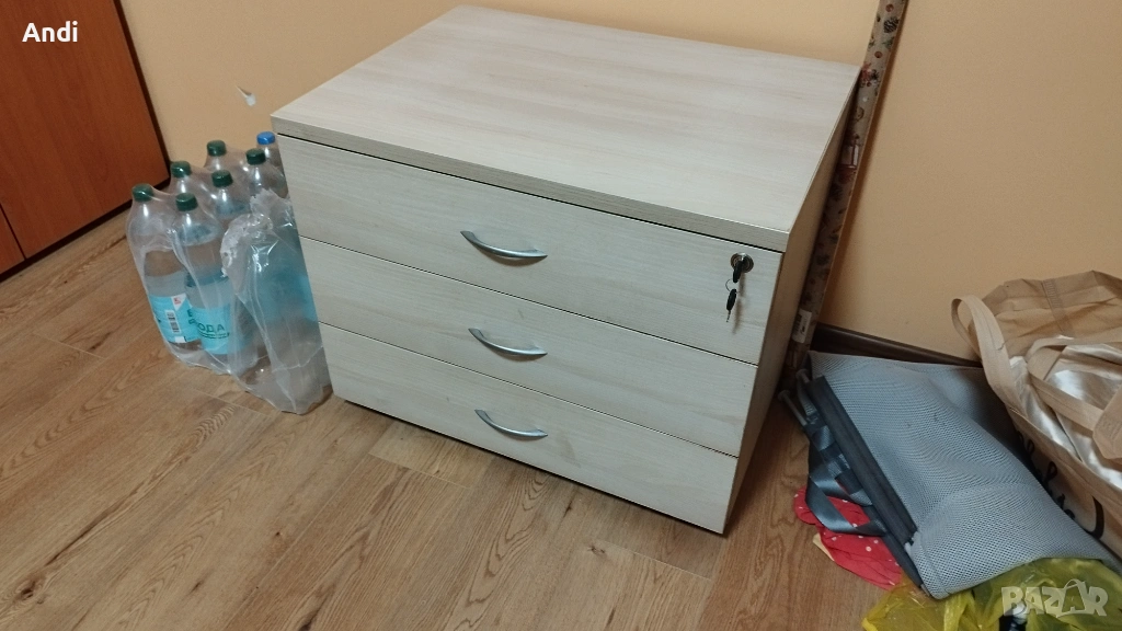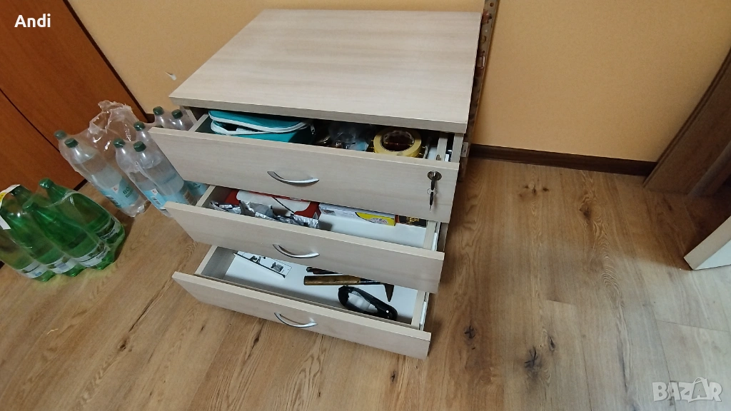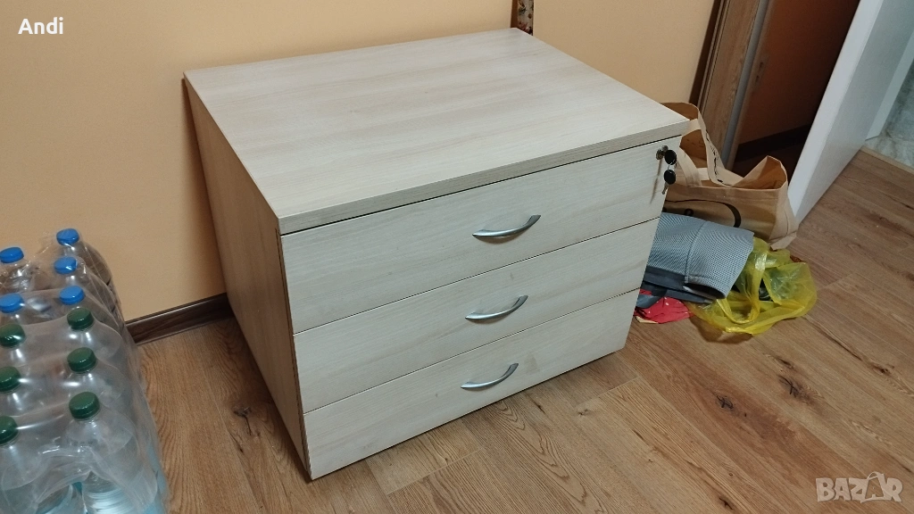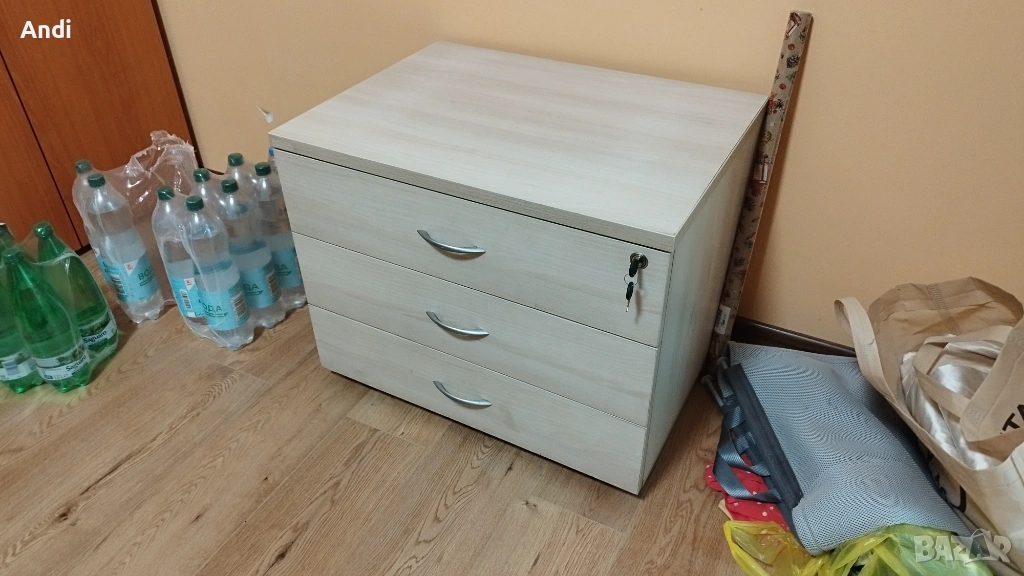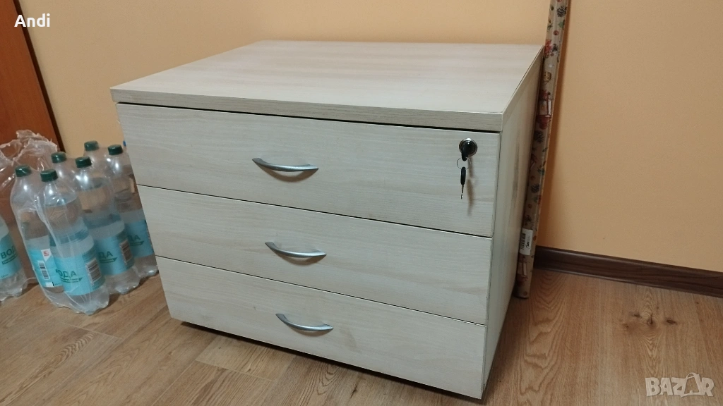 Продавам контейнери - кантонерка за офис бюро, може да се използва за документи или техника, шкафа е на крачета, с три чекмеджета. Шкафчетата са изработени от ПДЧ с цвят избелен дъб