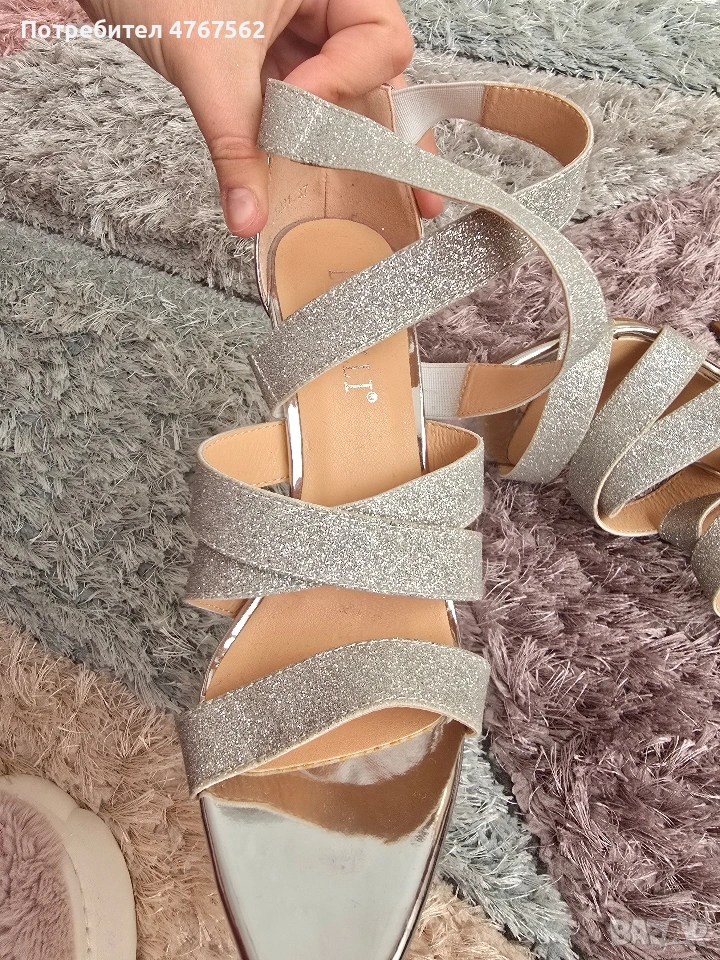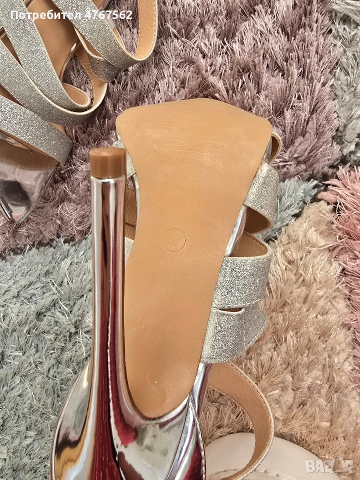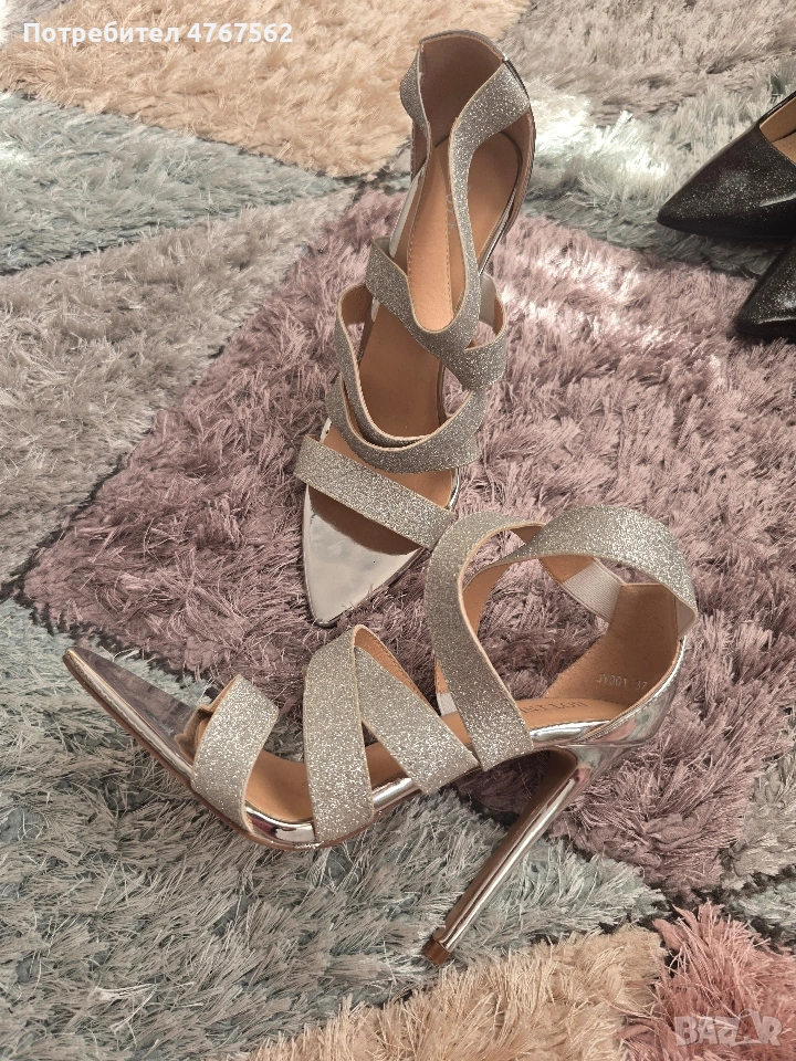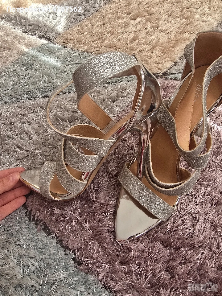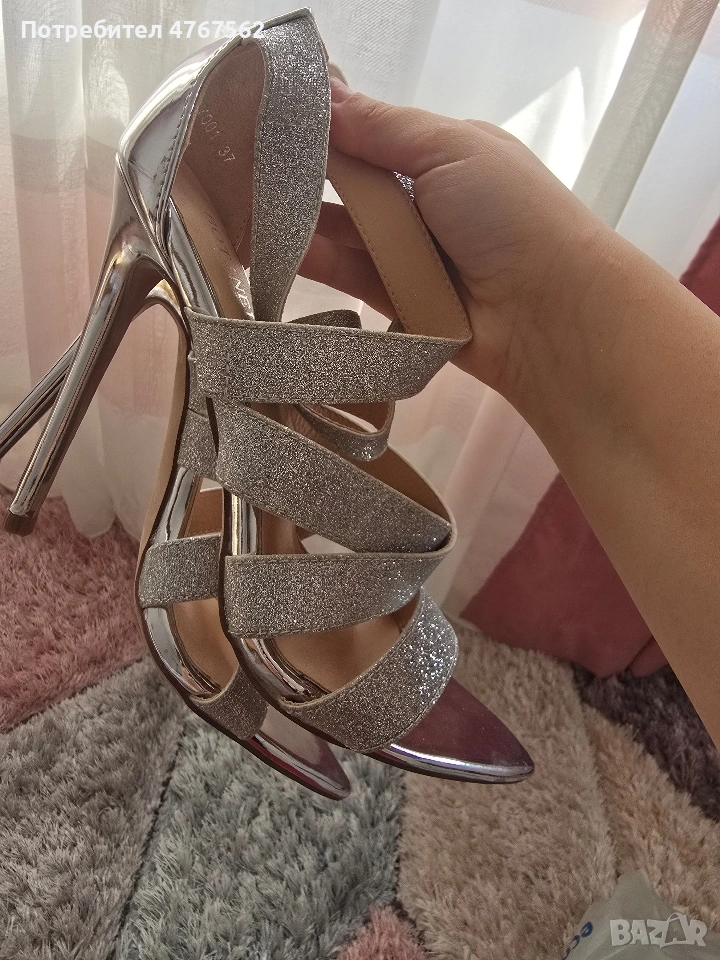 Нови лъскави сребристи токчени обувки, само пробвани, без кутия, размер 37.