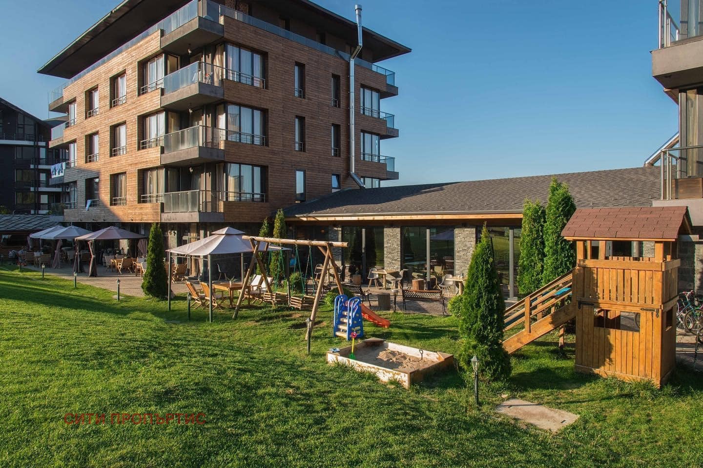 Две тераси с красива гледка към планината и зелените площи на комплекса