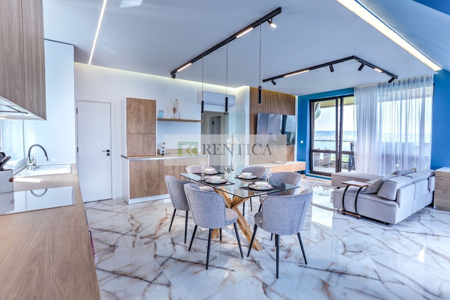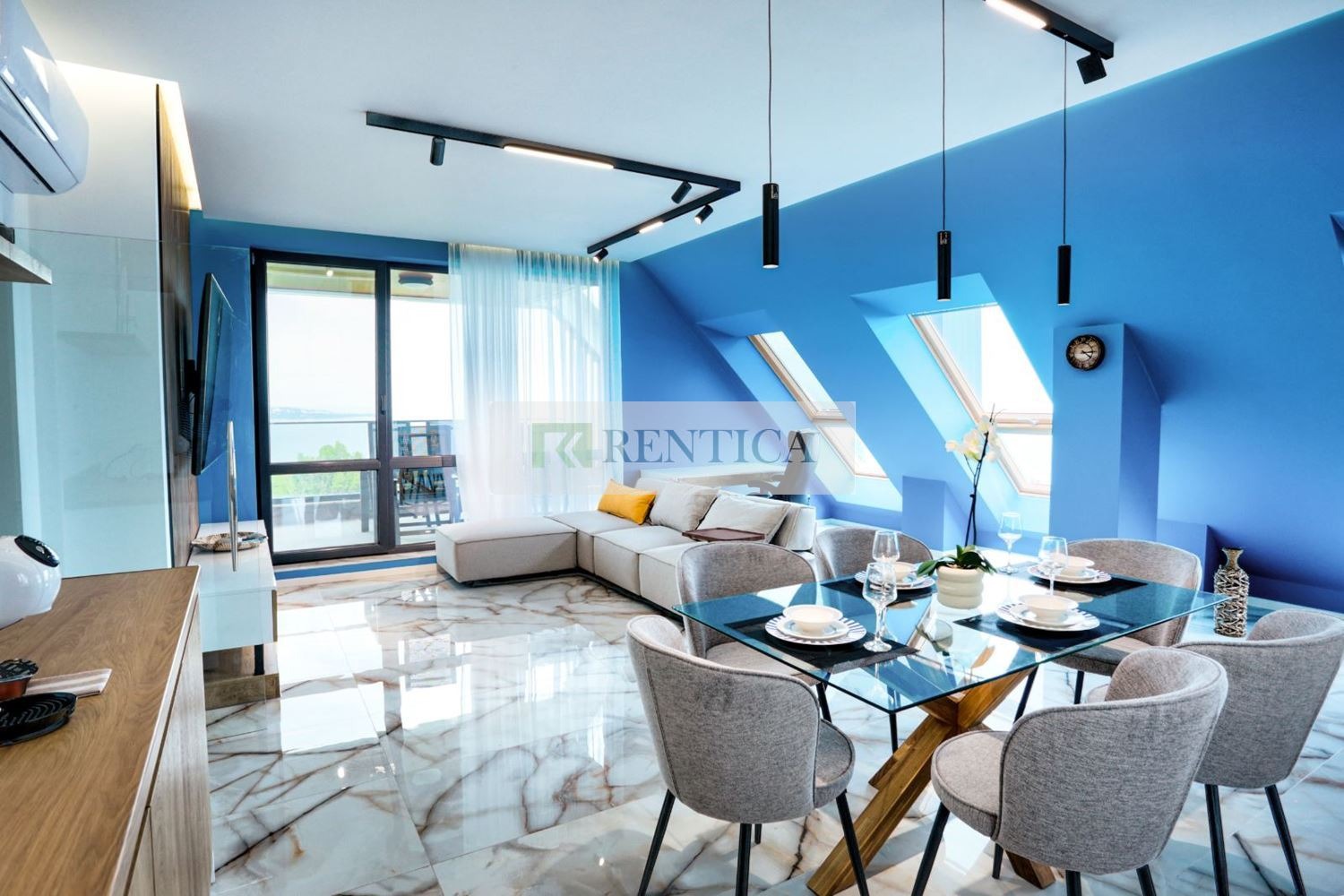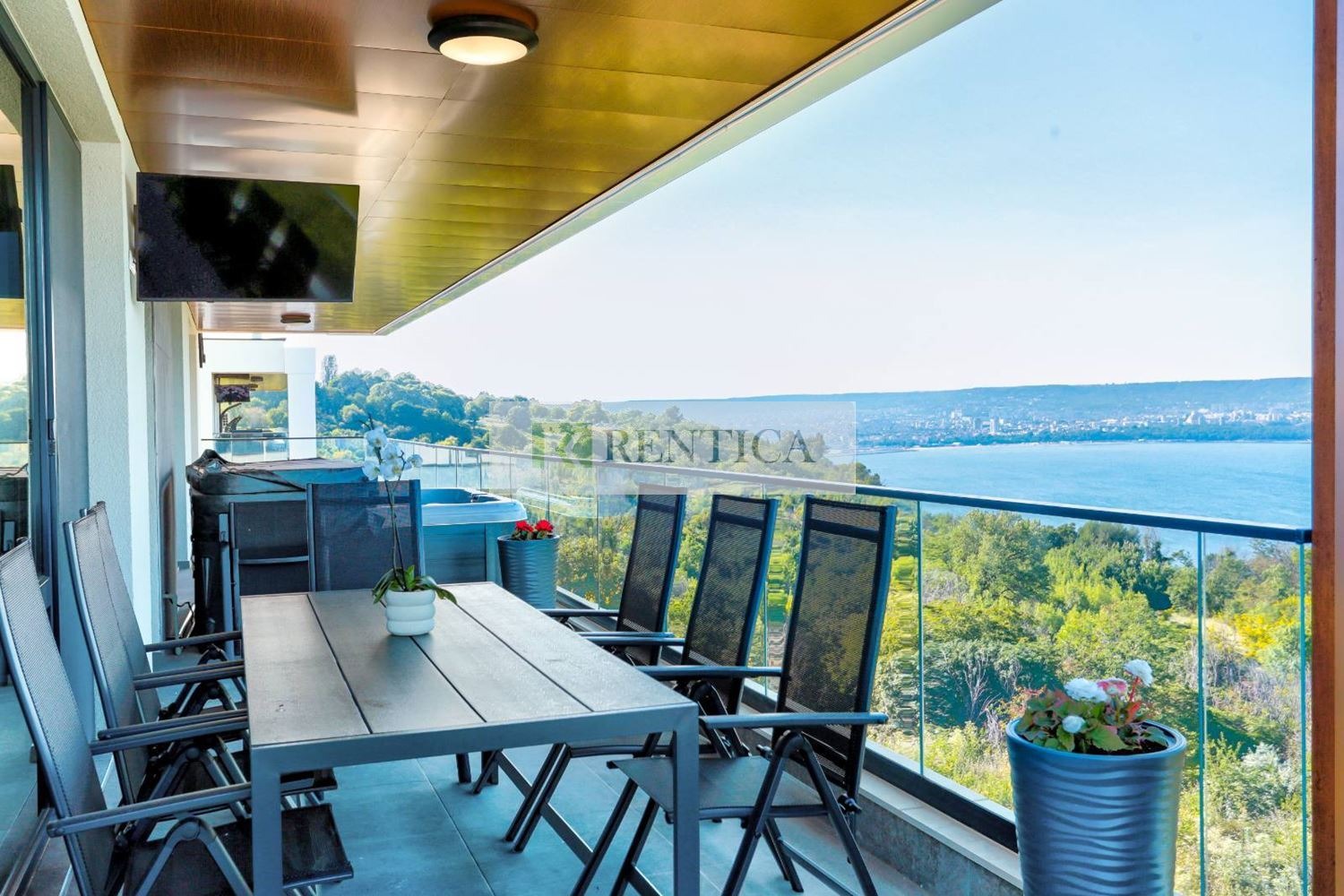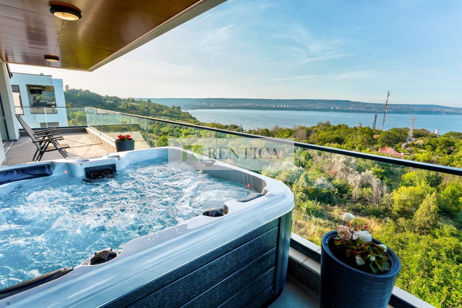 ОФЕРТА 7546 Rentica.bg предлага под наем ЧИСТО НОВ, уникален апартамент с ТРИ спални в кв. Галата, в непосредствена близост до морския бряг. Апартаментът се намира на последен етаж в комплекс от затворен тип с контрол на достъп, видео наблюдение, озеленен вътрешен двор, басейн със солена вода, зона с шезлонги, барбекю зона. Жилището е с площ от 207 кв.м. и се състои от коридор, просторен дневен тракт с кухненски бокс оборудван с необходимата домакинска ел. техника, ТРИ спални, две бани с тоалетна, голяма панорамна тераса с джакузи, маса за хранене, люлка за двама. Жилището се предлага напълно обзаведено и оборудвано с всичко необходимо за домакинството. Частен асансьор, който спира в апартамента и тръгва от собствен гараж. Отоплението е с климатици. Такса поддръжка, интернет, два ГАРАЖА и основно почистване един път месечно 300 евро на месец!