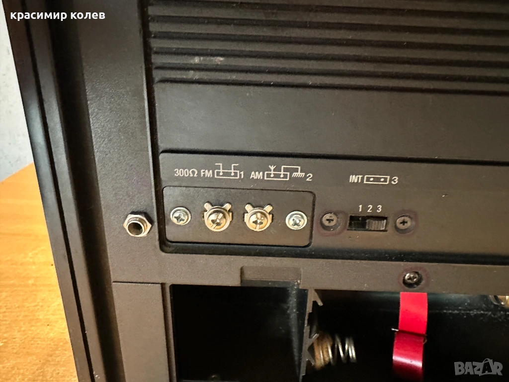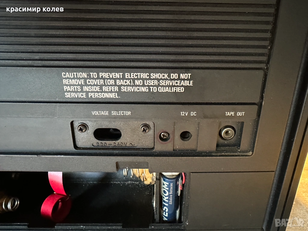 - Метални дръжки отстрани, голям говорител, захранване на батерии (4×D + 2×AA за часовника) или ток.