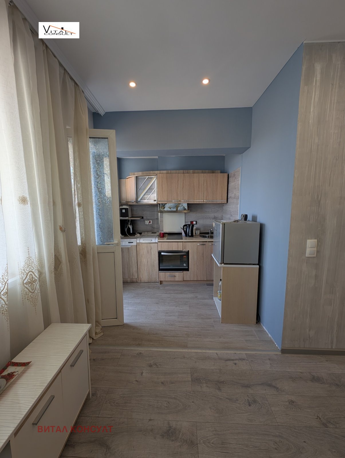 Изцяло санирана масивна сграда с поддържан вход и стълбище; Основно ремонтиран и обзаведен апартамент, климатици; Състои се от просторна дневна в две части на теракота, със светъл кухненски бокс с вградена бяла техника, източна тераса към вътрешен двор, самостоятелна спалня на ламинат със западно изложение, баня с тоалетна - заедно на фаянс и теракота, антре на теракота с портманто; Високите тавани, интериорните решения и стилното обзавеждане създават простор и уют в жилището. Прилежащи - таван 9.70 кв.м. /над имота/ с изкарани ВиК, Мазе 4.60 кв.м.; Отлична локация - непосредствена близост до аранжирани градинки, Метростанция, спирки на градски транспорт и на пешеходно разстояние от административния център на града; Жилището е подходящо и за инвестиция;