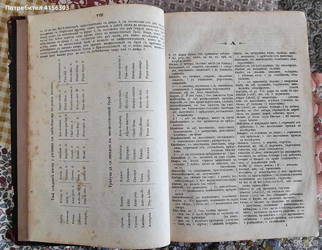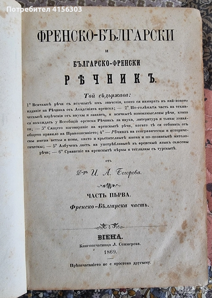 Старопечатна. Речник. Д-р. И.А.Богоров. Виена. 1869. Част първа. Френско-Български речник. 516 стр. Твърди корици. В много добро състояние. Без липси или скъсани страници.