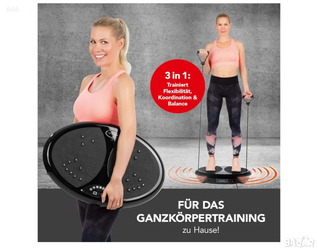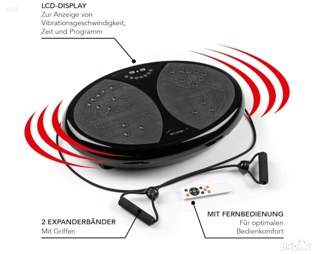 Тренирайте лесно у дома сега! Вибрационният тренажор Vitalmaxx изисква гъвкавост, координация и баланс на тялото ви. Просто го включете и започнете - с 10 предварително зададени програми, има перфектната тренировка за почти всяко ниво на физическа подготовка. Стабилна вибрираща плоча с неплъзгаща се дръжка за различни упражнения със и без разширителни ленти. 99 индивидуално регулируеми настройки за скорост. LED дисплей за време и скорост на тренировка. С дистанционно управление за оптимален комфорт на потребителя.