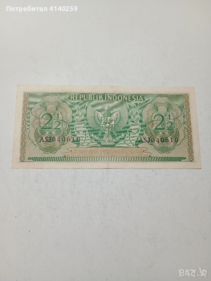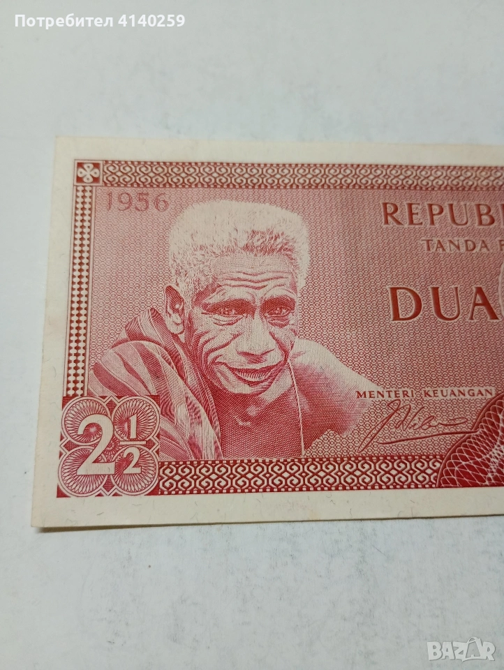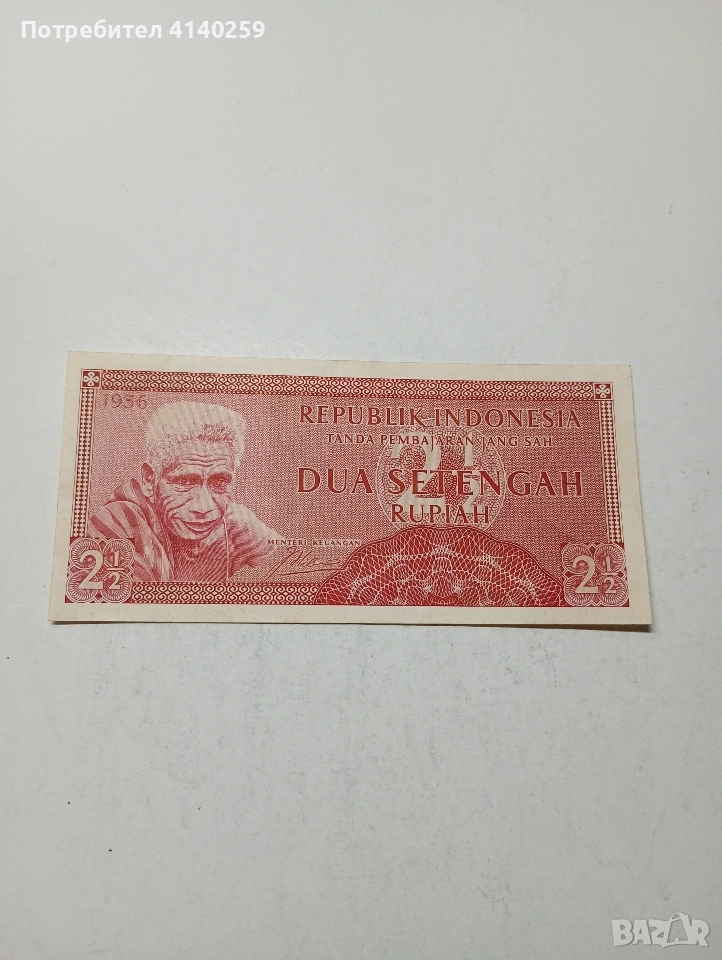 ИНДОНЕЗИЯ БАНКНОТА 2 1/2 РУПИЯ 1956 Г СЪСТОЯНИЕ НОВО ПОЛУЧАВАТЕ СНИМАНАТА БАНКНОТА РАЗГЛЕДАЙТЕ ДРУГИТЕ МИ ОБЯВИ ДА КОМБИНИРАТЕ ДОСТАВКА ЕКОНТ ЗА ВАРНА ЛИЧНО