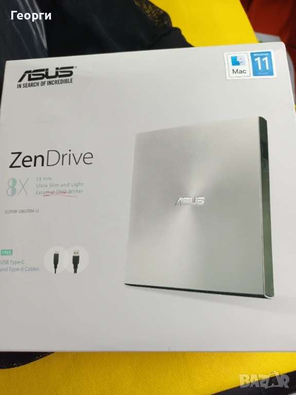 външна DVD записвачка Asus ZenDrive U9M (модел SDRW-08U9M-U).