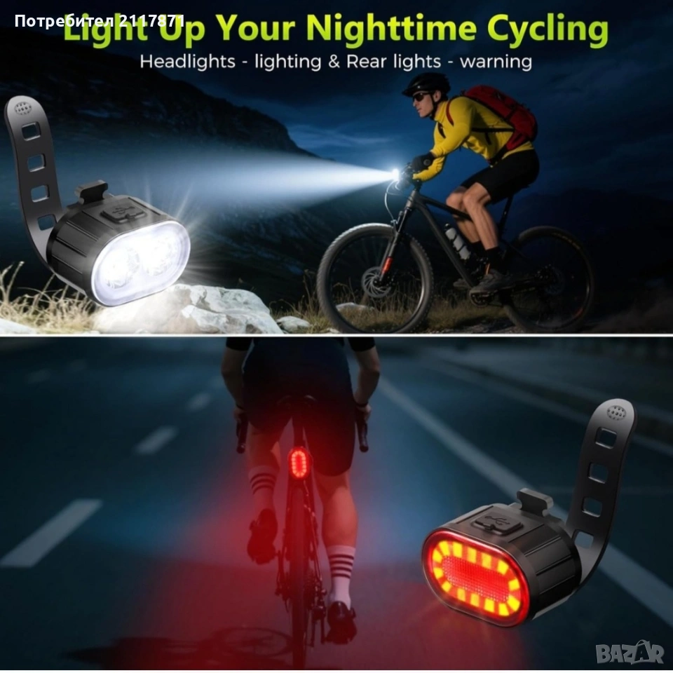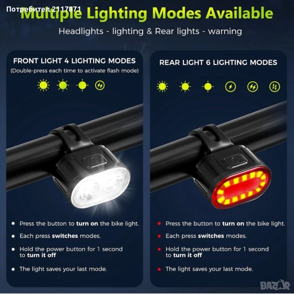 Уникален дизайн и множество режими: Пълен комплект фар и стоп с различни режими на осветление. Контролирани независимо, те могат да се използват самостоятелно или комбинирано според нуждите. Всяка светлина идва със силиконова каишка.