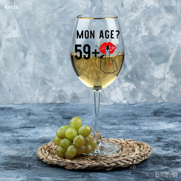 Tази кристална чаша за вино е гравирана с текста "MON AGE? 59 + FINGER", който няма да избледнее или да избледнее с времето. За разлика от други продукти, надписът е издръжлив и лесен за почистване. Проектирана за години ежедневна употреба, препоръчва се да се мие на ръка, за да се запази блясъкът ѝ.