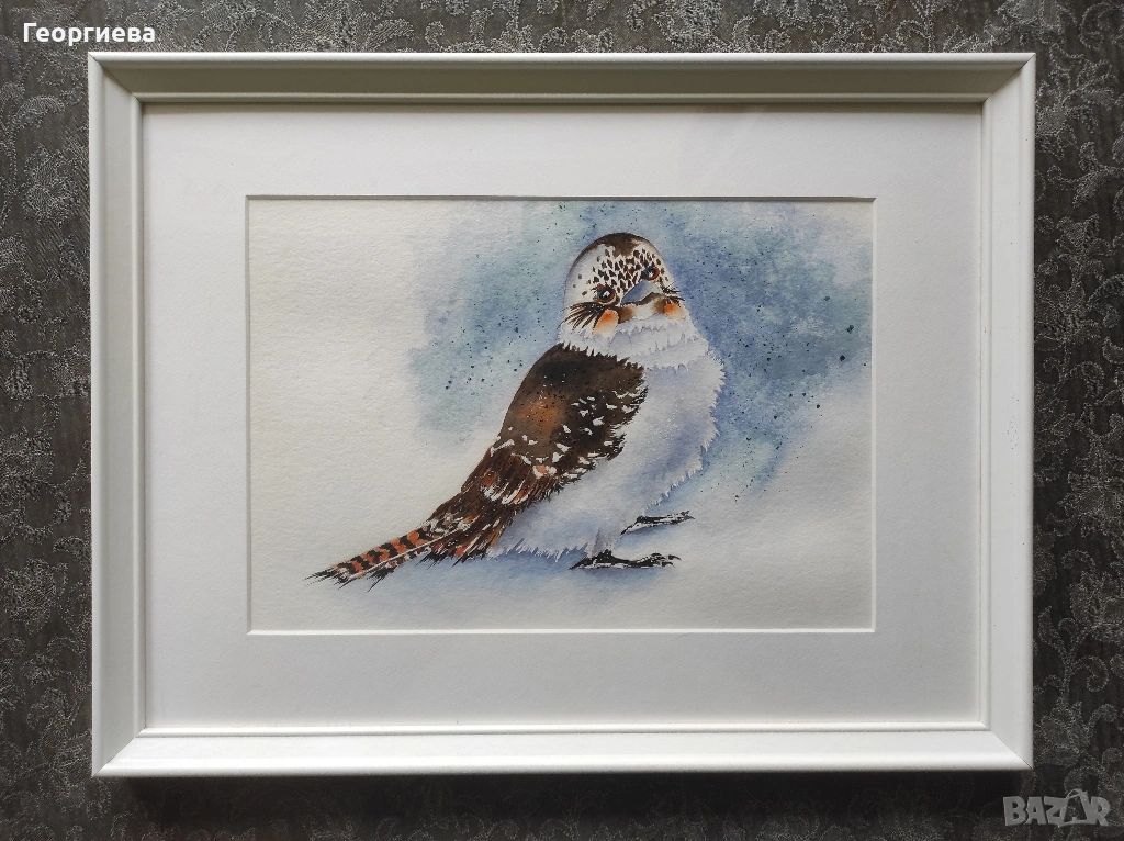 Красива картина с изображение на птица в рамка. Картината е изработена с акварелни бои и показва детайлно оперението и изражението на птицата. Рамката е бяла, което допълва добре цветовете на картината. Подходящ декоративен елемент за дома или офиса.