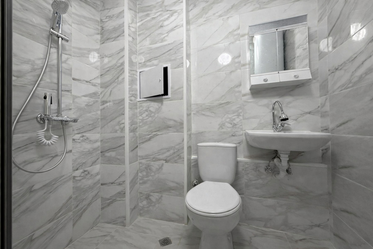 Имотът е ситуиран на 6-ти жилищен етаж и разполага с площ 80кв.м, разгърната в следното разпределение: входно антре, хол с кухненски бокс, две спални, баня с тоалетна и тераса.