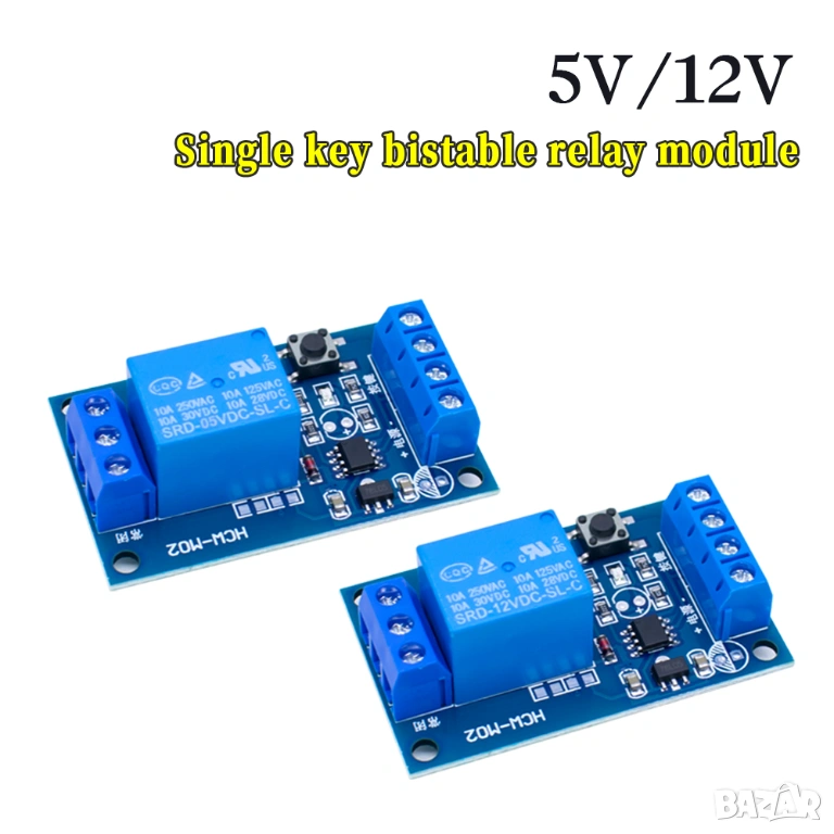 Този 12V бистабилен реле модул (latching relay) позволява управление на електрически устройства чрез един бутон, като всяко натискане сменя състоянието – включено или изключено.
