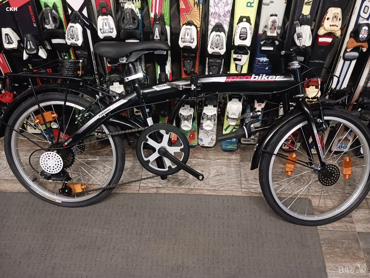 6 скорости, багажник, калници,свободен венец, гуми KENDA,две спирачки,предпазител за веригата, заден стоп, сгъваеми педали