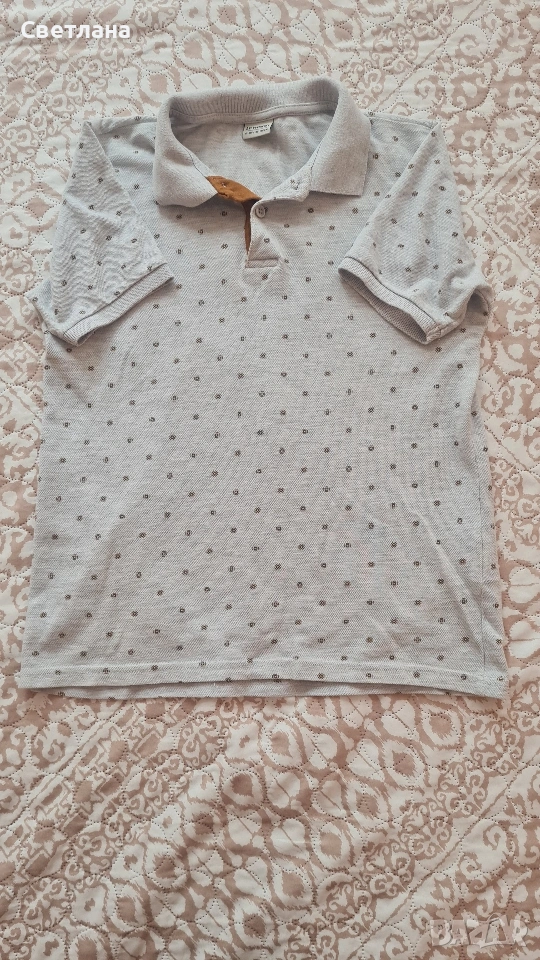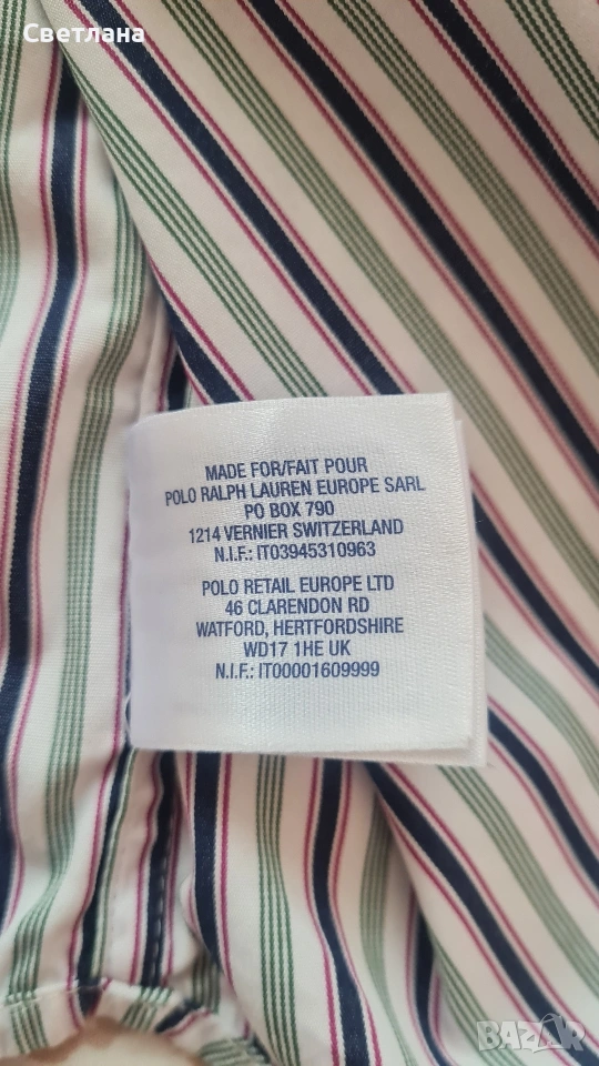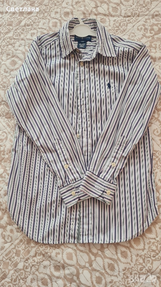 Детска риза с дълъг ръкав Ralf Lauren Размери: • Дължина – 56 см • Ширина – 37 см • Ръкав (от рамо) – 45 см Ризата е като нова – обличана само веднъж за повод, без никакви забележки. Подарък към нея: 2 спортни ризи с къс ръкав Waikiki – в добро състояние, с нормални следи от носене. Цената е крайна.