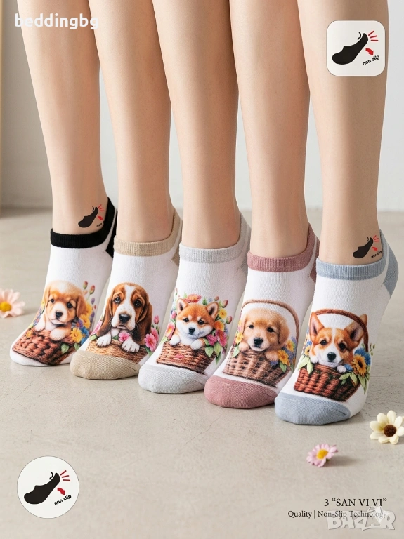 [НОВО] Дамски памучни терлици с кученца 5чф. (35-40) – Силиконова пета