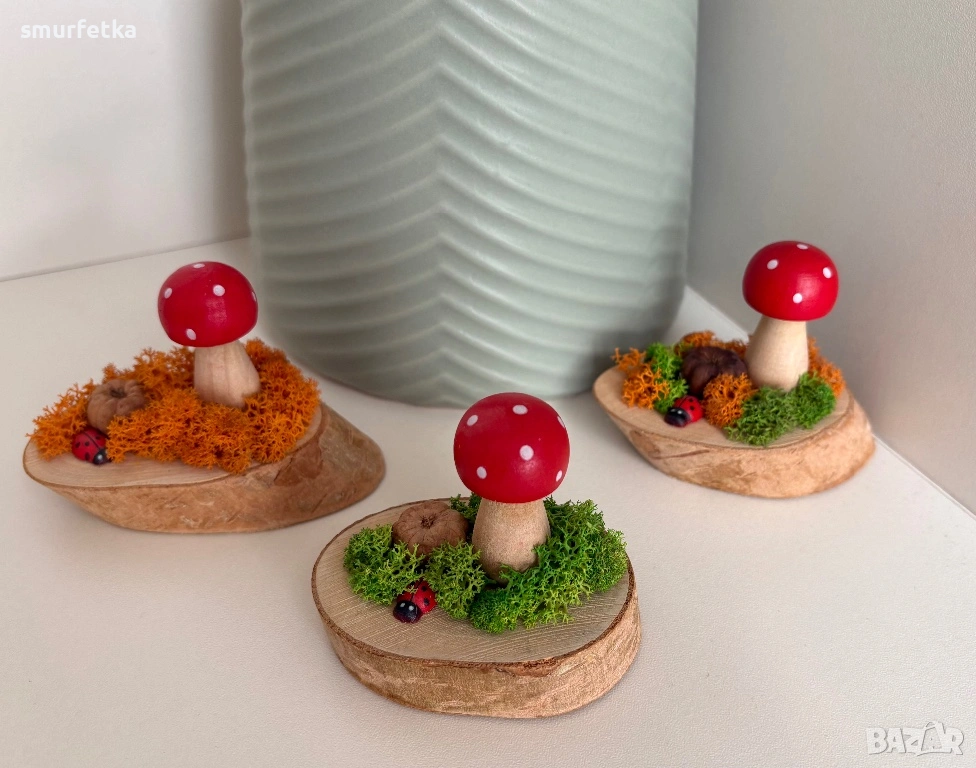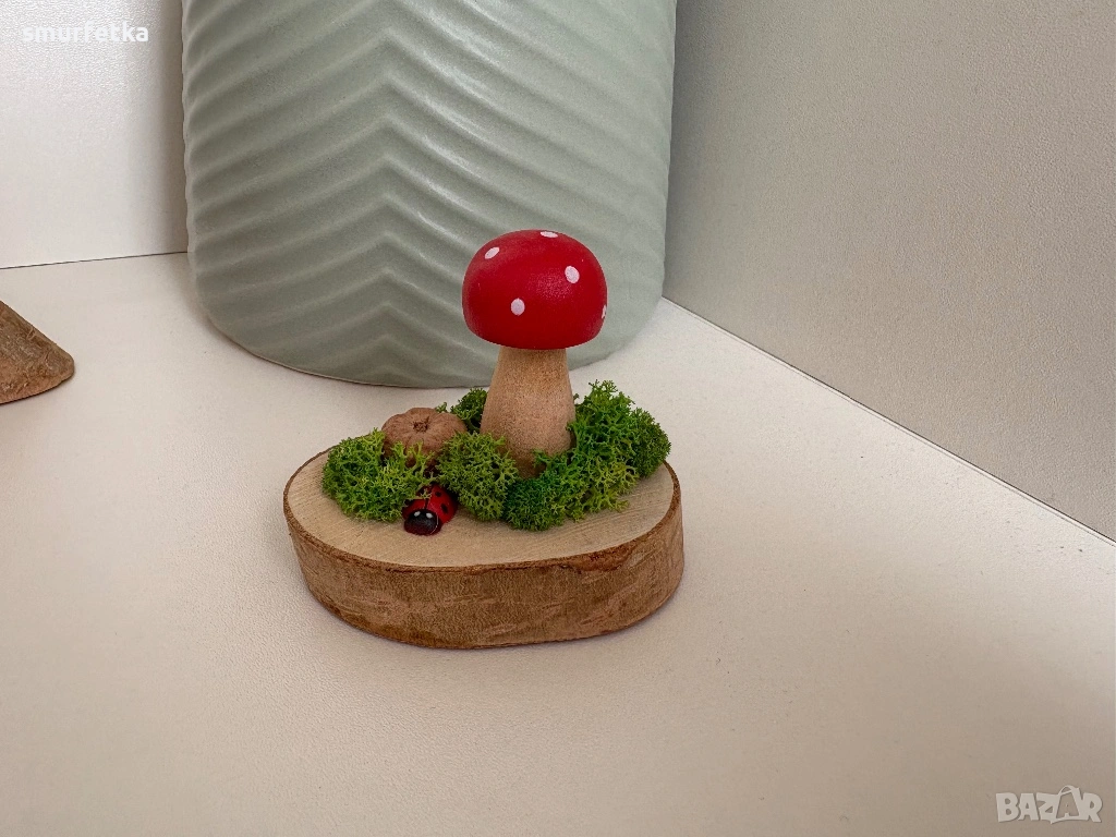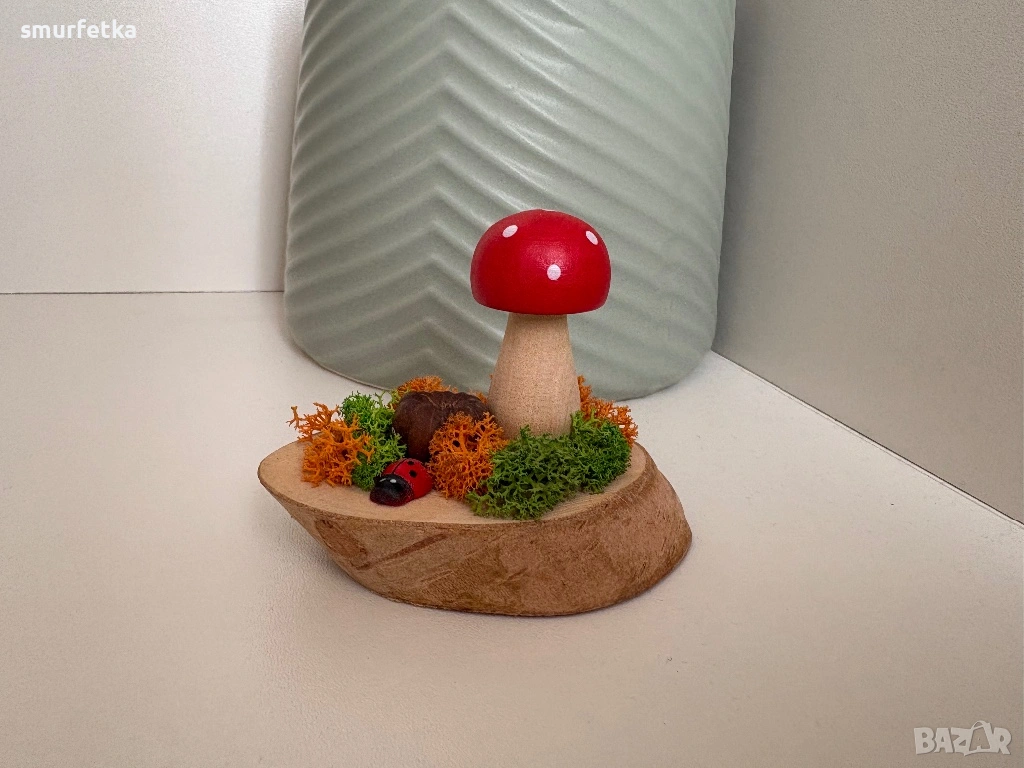 Всяко парченце е направено с внимание и любов – дървена основа, мъх, малка калинка и ярка гъбка, която веднага привлича погледа.