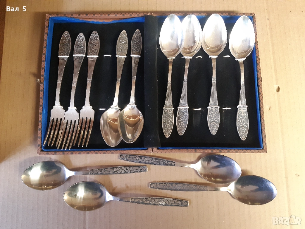 3 вилици и 6 + 4 лъжици в оригинална кутия . Дебело посребрени , тежки , масивни , качествени , не са почистени . Четирите лъжици извън кутията също са съветски , но не са посребрени . 2а 4