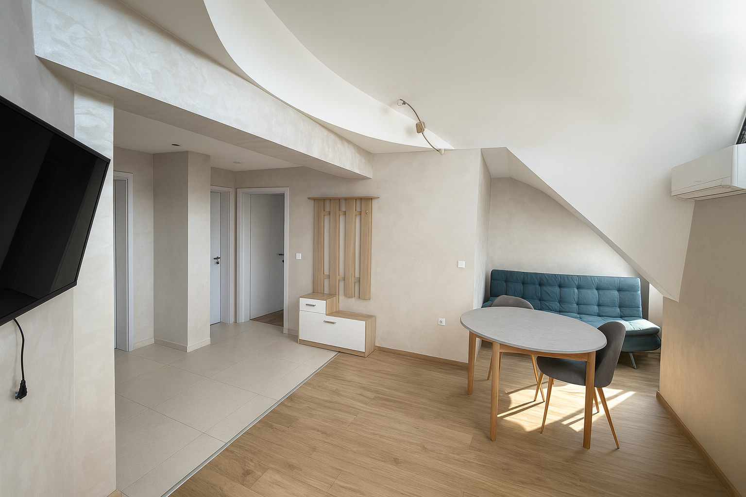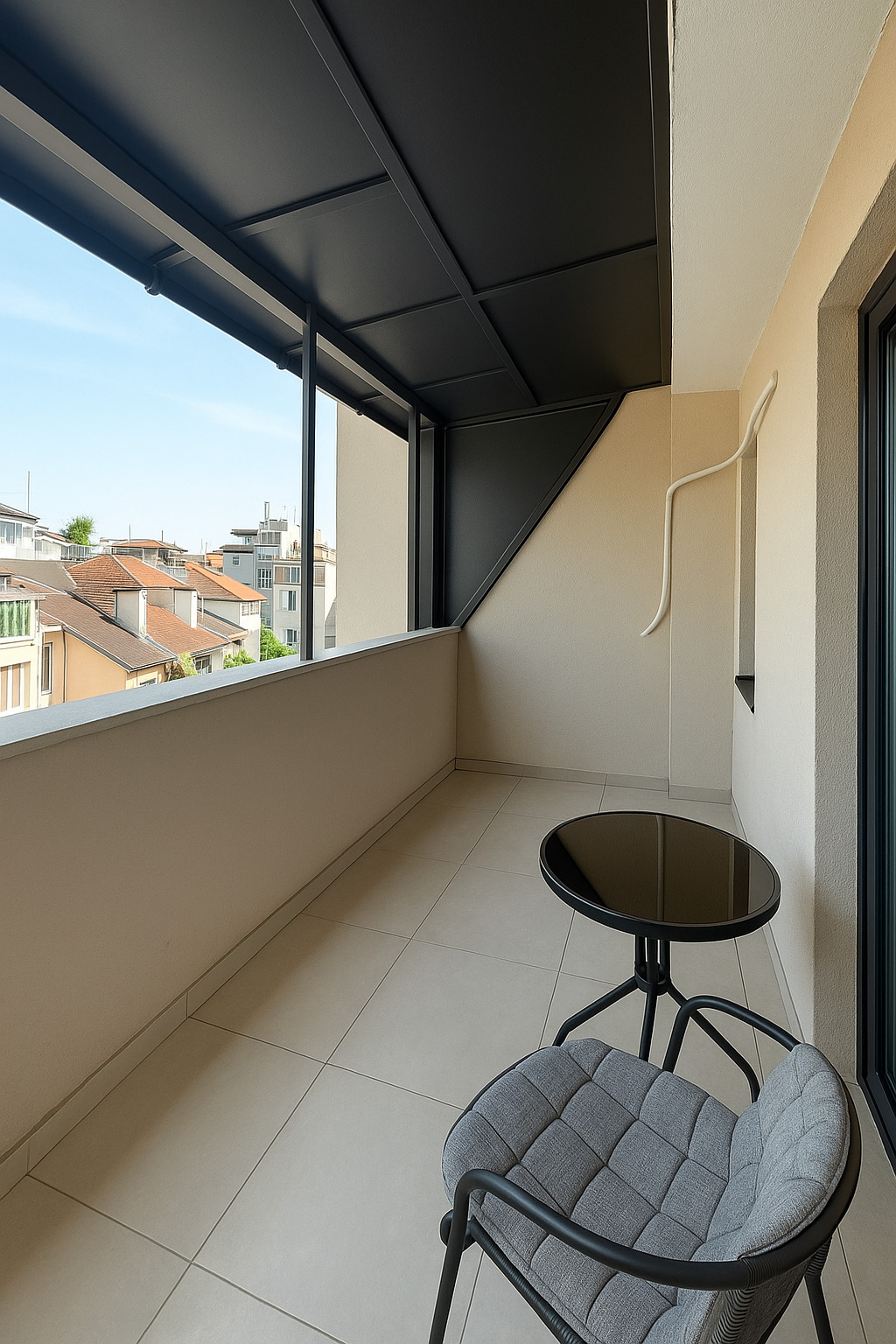 Апартаментът разполага с функционално разпределение, което осигурява комфорт и уют. Дневната с кухненски бокс е светла и просторна, а терасата предлага открито пространство с гледка към централната част на града. Имотът е подходящ за дългосрочно отдаване под наем, краткосрочни настанявания или лично ползване.