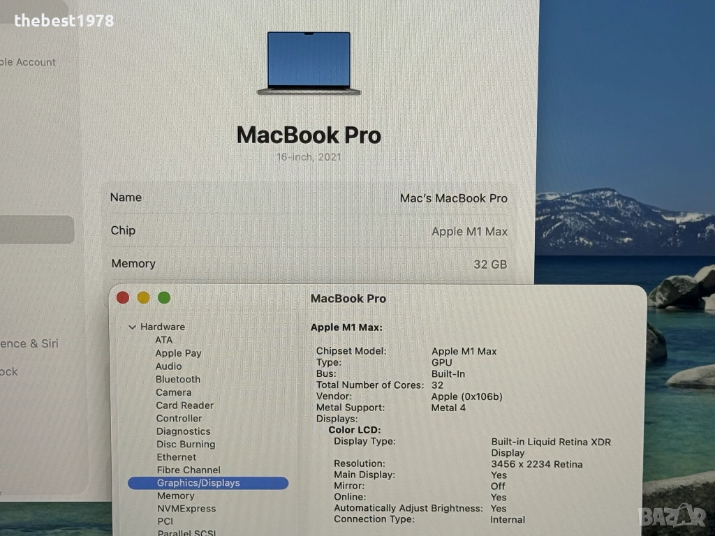 Apple MacBook Pro "M1 Max" 10 CPU/32 GPU...Лаптопа е неразличим от нов,ползавн едва 2-3 месеца.