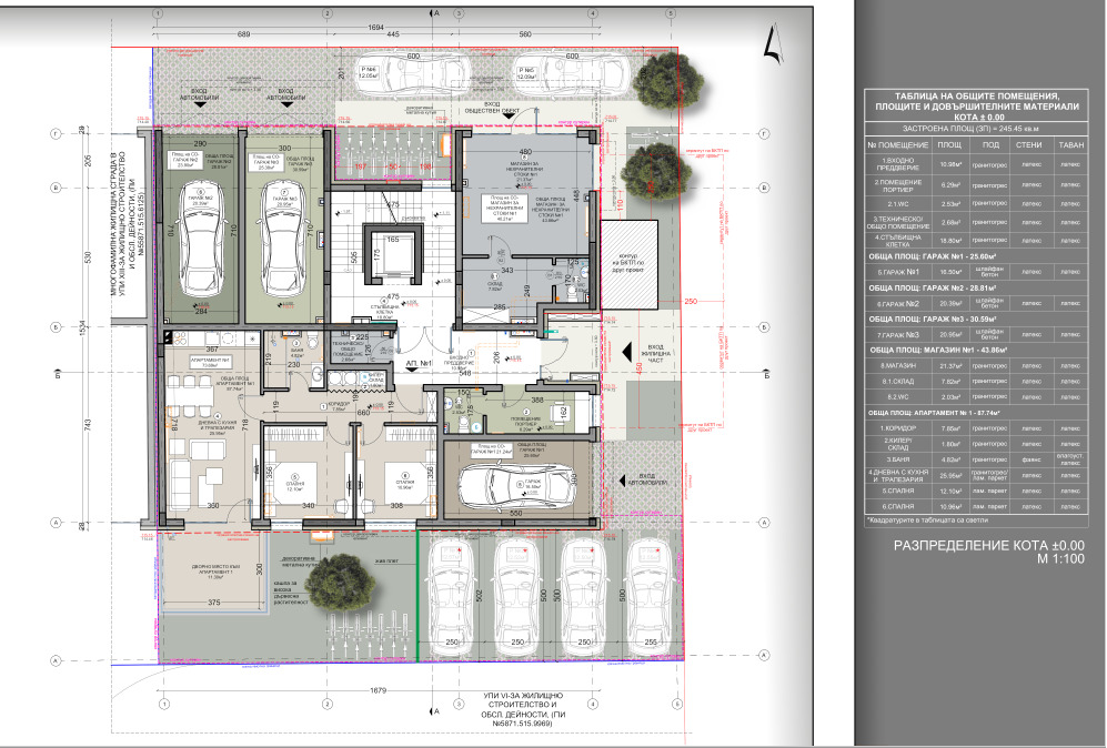 Общите части са изпълнени с гранит/гранитогрес, както и силикатна мозаечна мазилка.