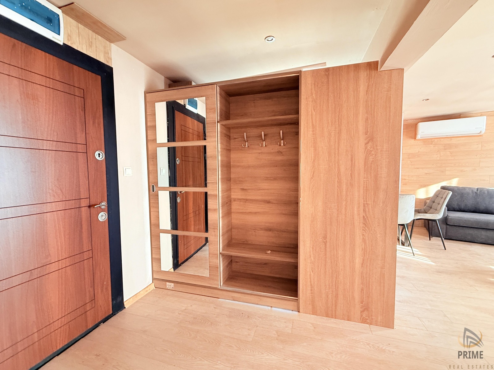 РАЗПРЕДЕЛЕНИЕ: Входно антре, хол с кухня, спалня, баня с тоалетна и две тераси.