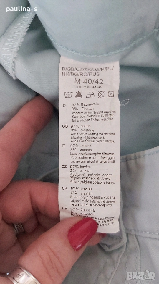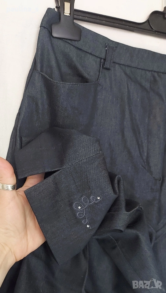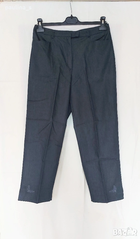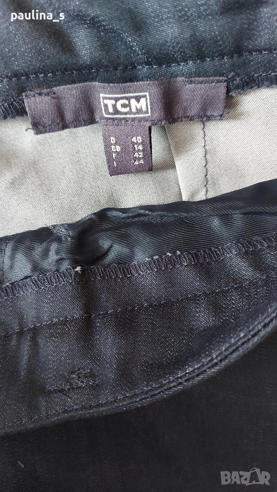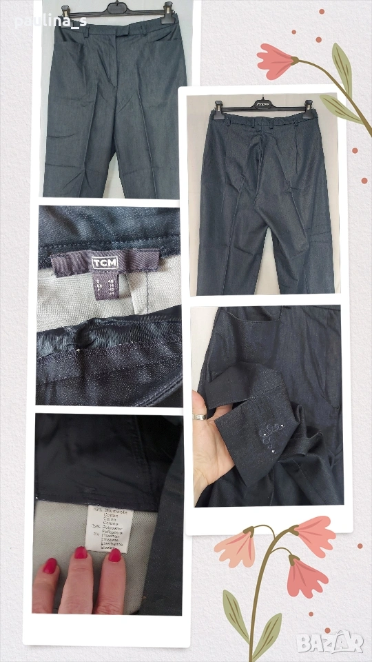 1️⃣ M / XL - "TCM". Цената е крайна, без пазарлъци 10 евро. Еластичен брандов панталон с бродерия на крачолите и цепки. Моделът е прав и обран с хоризонтални джобове, гайките са тесни! Покрива дрескода за офис или повод. Материята е памук и ликра, доста еластична. Покрива няколко размера. Никога не е ползван, нов, без дефекти и етикет, една бройка е само.