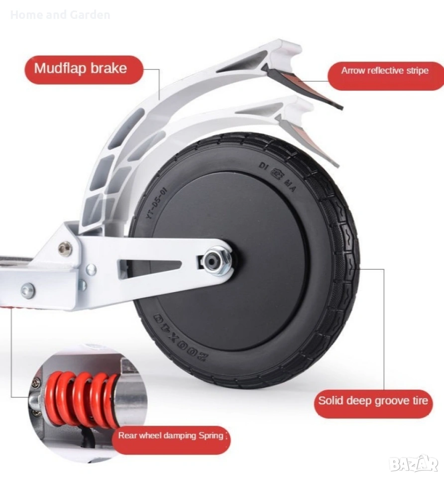 Електрическа тротинетка с 8-инчови гуми и двойна амортизационна система. Сгъваема конструкция за лесно транспортиране. Спирачка с калник и светлоотразителна лента за безопасност.