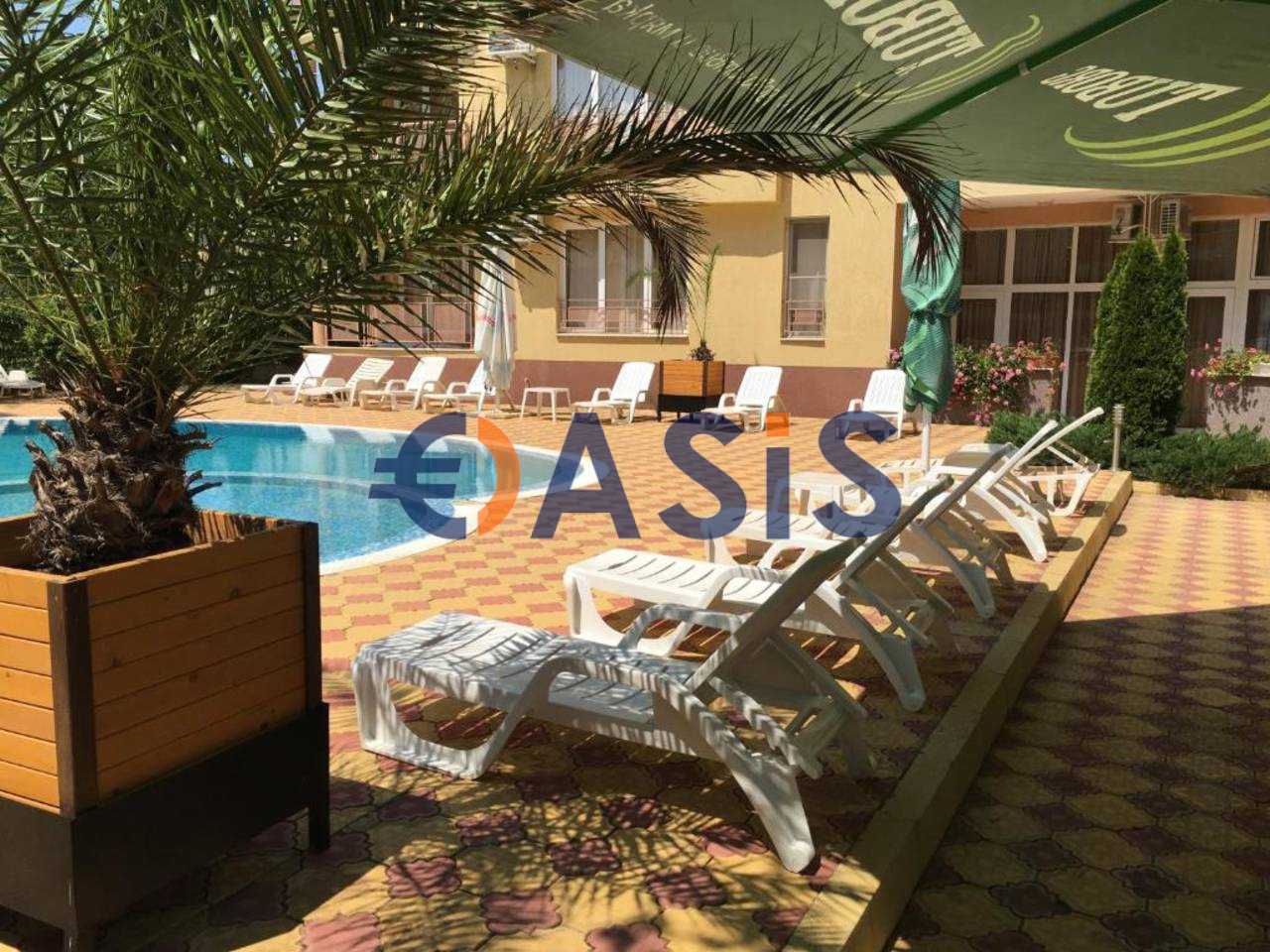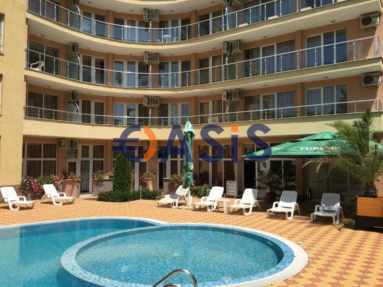 Апартаментът се намира на втория етаж на апартхотел в спокойната северна част на Слънчев бряг, в близост до паркова зона и на около 450 метра от морския бряг.