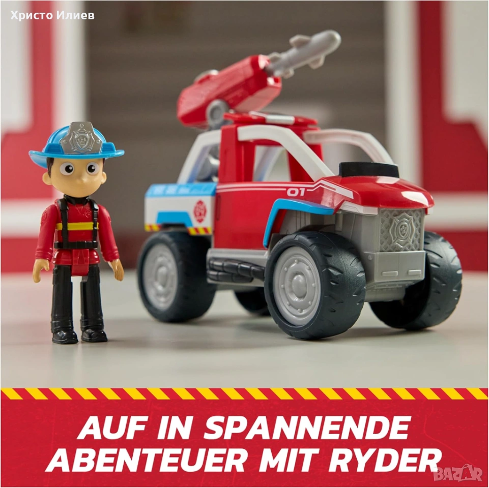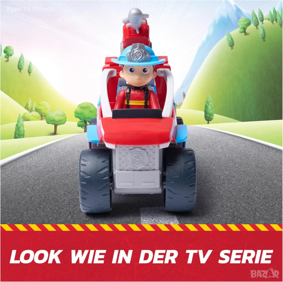 - Спасително превозно средство PAW Patrol в готин стил на пожарникари, високо приблизително 18 см, за да съответства на Райдър и с чудесни игрови характеристики. С това превозно средство могат да се започнат вълнуващи спасителни акции срещу пожар - точно както в поредицата.
