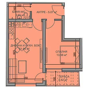дневна с кухненски бокс, спалня, баня с тоалетна, тераса