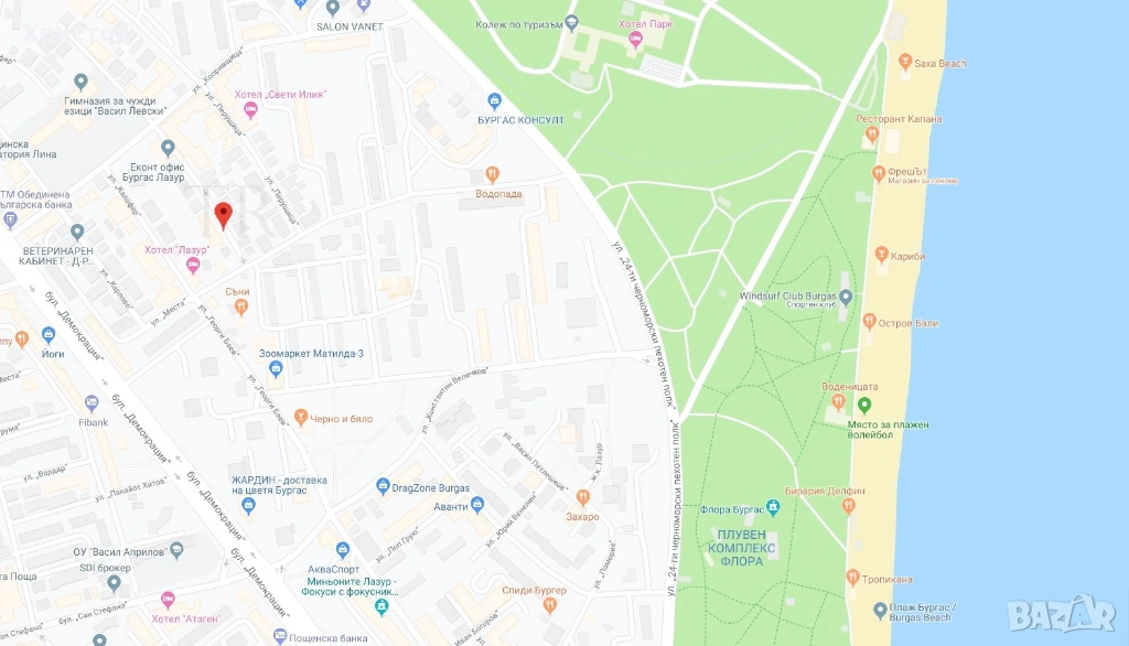 К Морского сада в жилом районе Лазурь на ул. Батак, в нескольких минутах ходьбы от центра Бургаса.