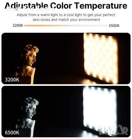 Регулируема цветна температура: изберете правилното настроение за вашите снимки. Цветната температура се регулира безстепенно от 3200 K до 6500 K.