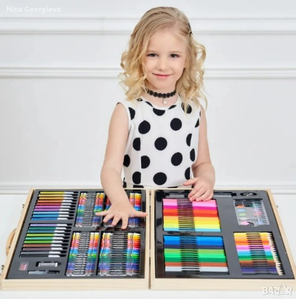 Детски комплект за рисуване - 180 части. Куфарът е изработен от дърво. Съдържа - 20 бр. цветни моливи, 12 бр. боички за рисуване, 40 бр. безмаслени пастели, 40 бр. маслени пастели, 20 бр. цветни флумастри с тънък писец, 36 бр. цветни флумастри с дебел писец, 8 бр. кламери, лепило, линия, гумичка, острилка. Подходящ за деца над 3г!