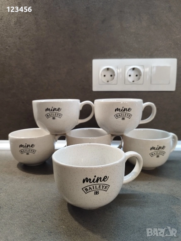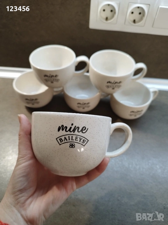 1. Комплект от 6 чаши за кафе/чай Baileys. Чашите са керамични, нови, цена 20 евро.