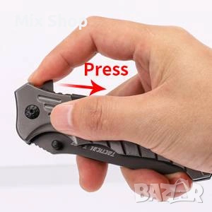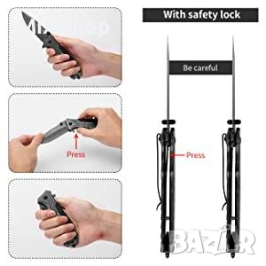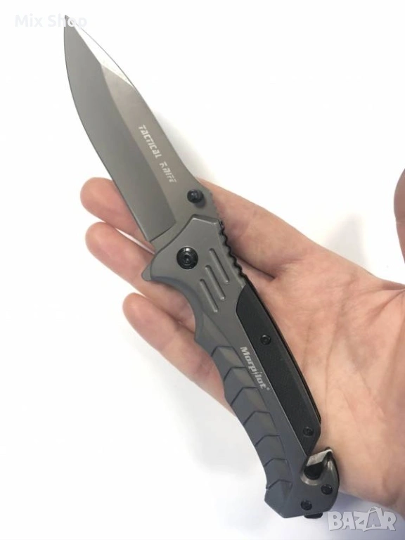 Сгъваем нож Morpilot 4 в 1 от неръждаема стомана 3CR13 с твърдост 58HRC, внос от Германия. С бутон за бързо освобождаване и ергономична дръжка. Подходящ за къмпинг, пикник, лов, риболов и в ежедневието. Снабден с отварачка за бутилки, нож за колани и разбивач на стъкло. Дължина в разгънато положение 215мм, дължина в сгънато положение 125мм, дължина на острието 80мм, тегло 220гр. Висока степен на корозия - IPX4 водоустойчив означава. Лесно отваряне на ножа с една ръка, надеждно заключване.