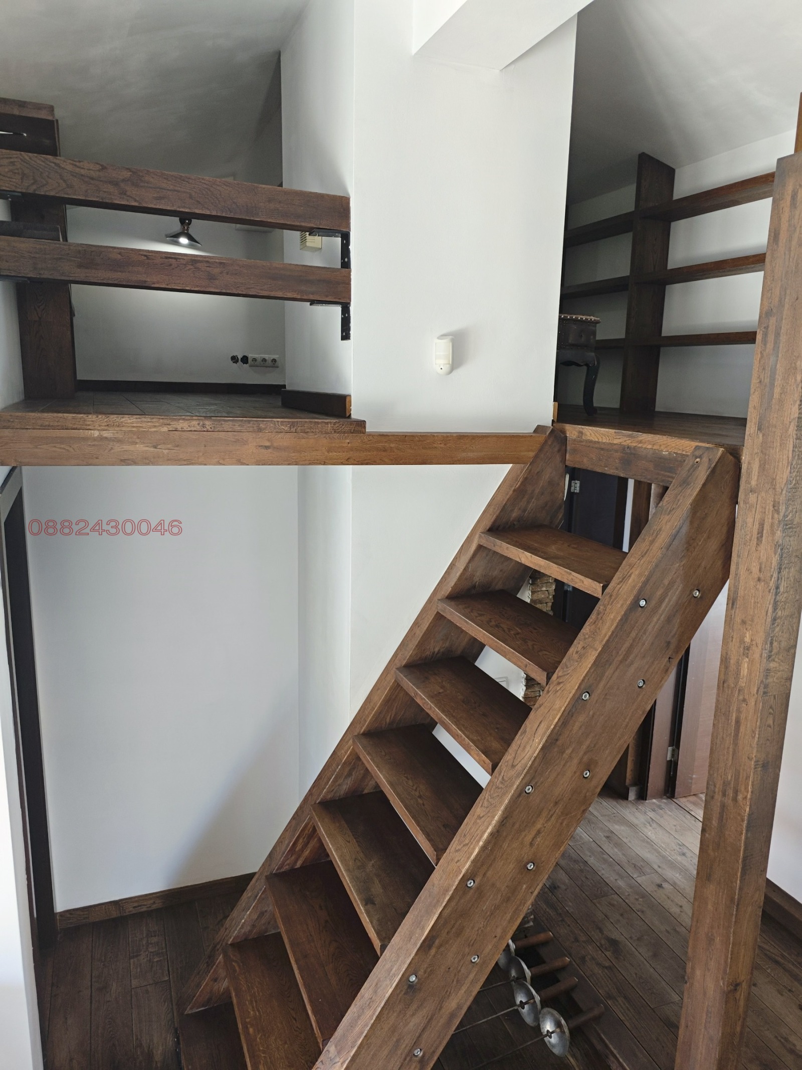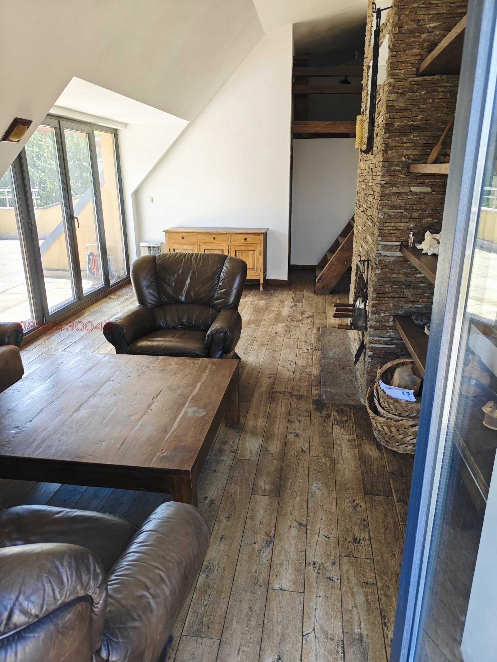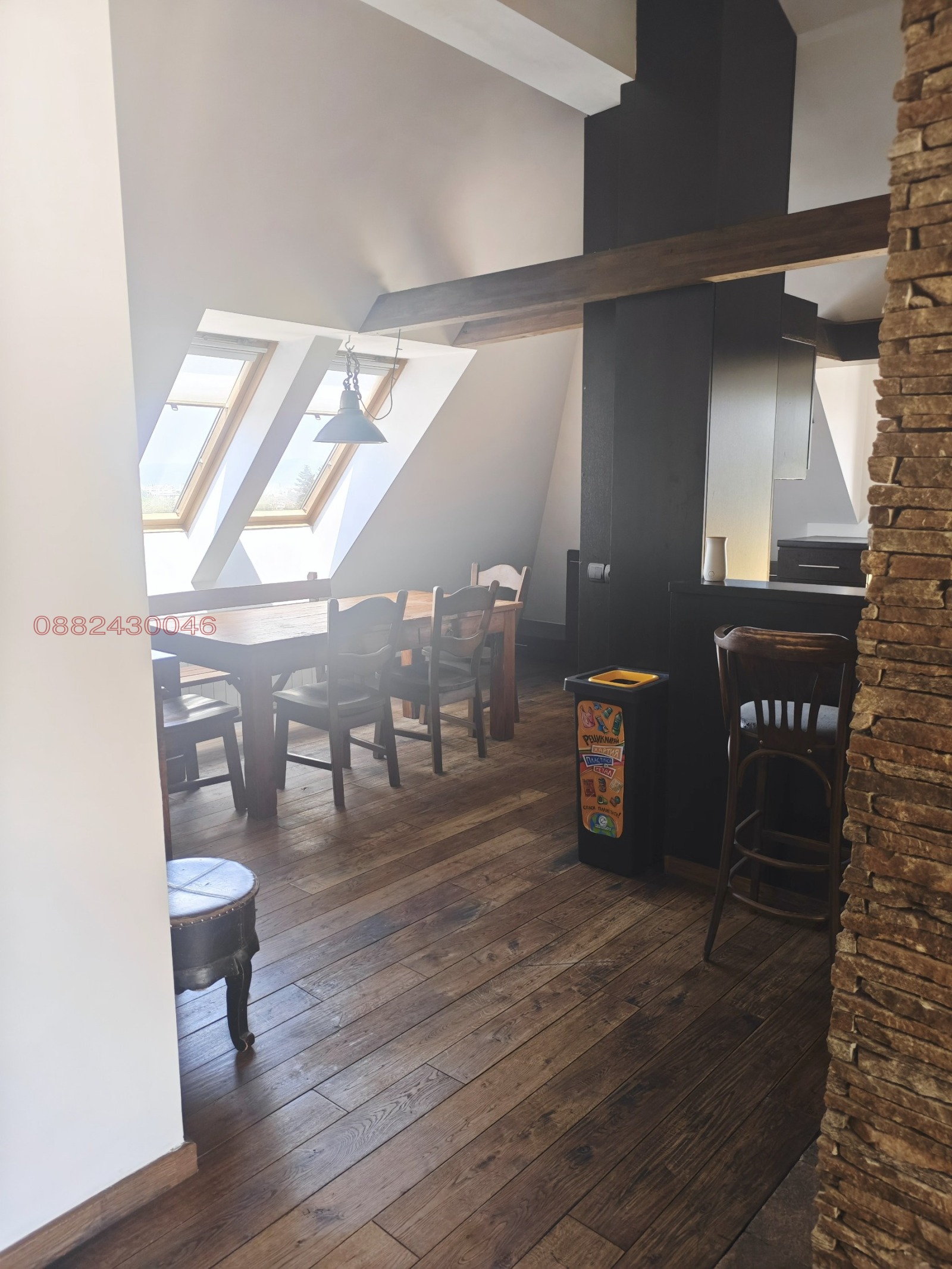 Апартамента е обзаведен с поръчково и изключително добре обработено естествено дърво, включително всички скринове, шкафове столове и маси в хола и трапезарията, както и цялата мансардна част.