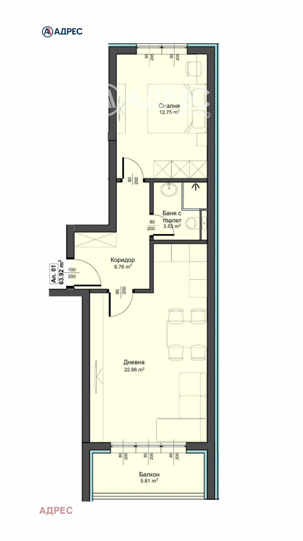 Жилището разполага с площ от 68 кв.м. разпределена в коридор, дневен тракт с кухненски бокс, спалня, балкон, баня и тоалетна.