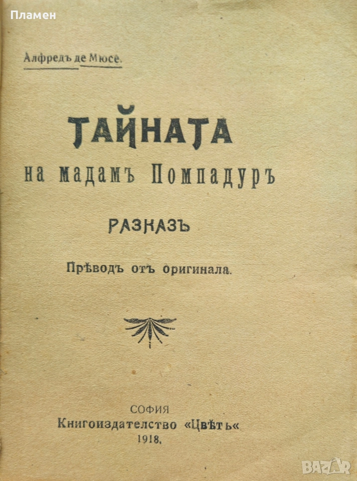 Тайната на мадамъ Помпадуръ Алфредъ дьо Мюсе /1918/, снимка 1 - Антикварни и старинни предмети - 53915215 Тайната на мадамъ Помпадуръ Алфредъ дьо Мюсе /1918/, снимка 2 - Антикварни и старинни предмети - 53915215 Тайната на мадамъ Помпадуръ Алфредъ дьо Мюсе /1918/, снимка 3 - Антикварни и старинни предмети - 53915215 1/3