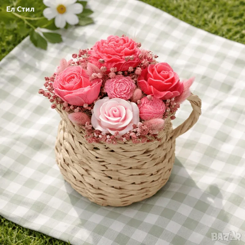 Букет от восъчни цветя в плетена кана за подарък