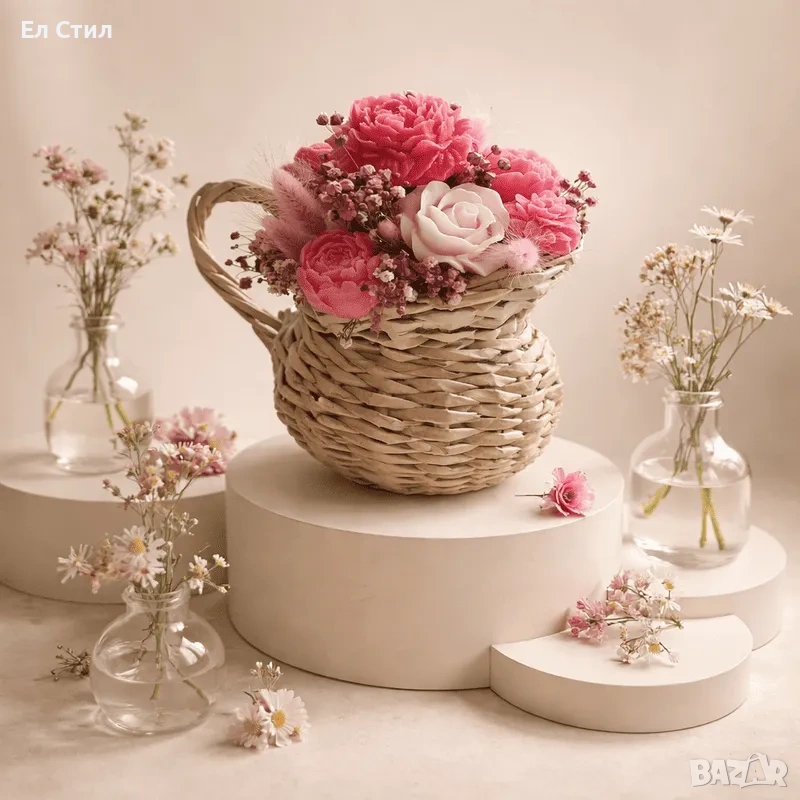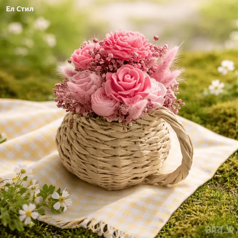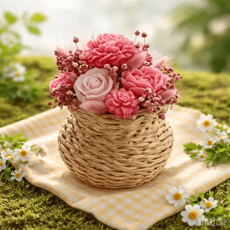 красив букет от цветя от соев восък аранжирани в ръчно плетена кашпа тип кана