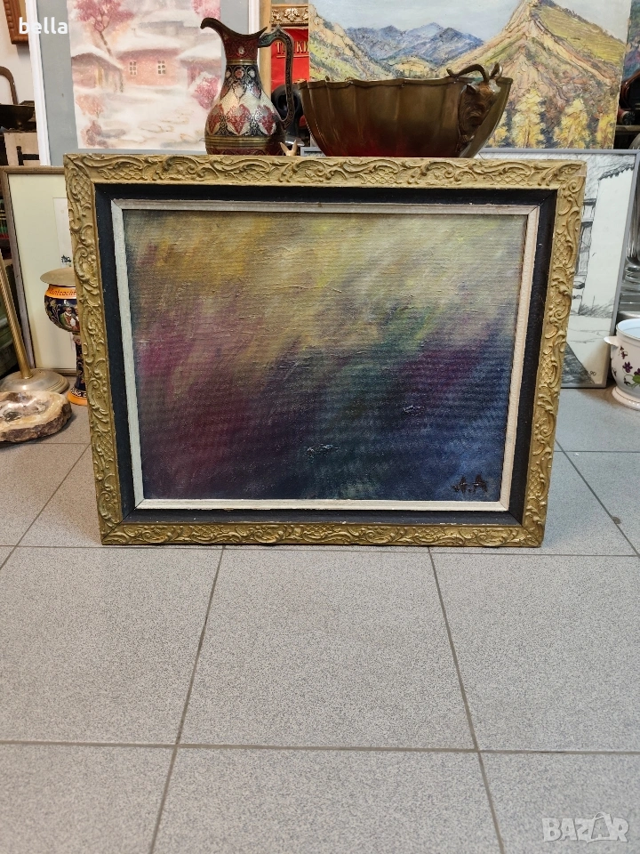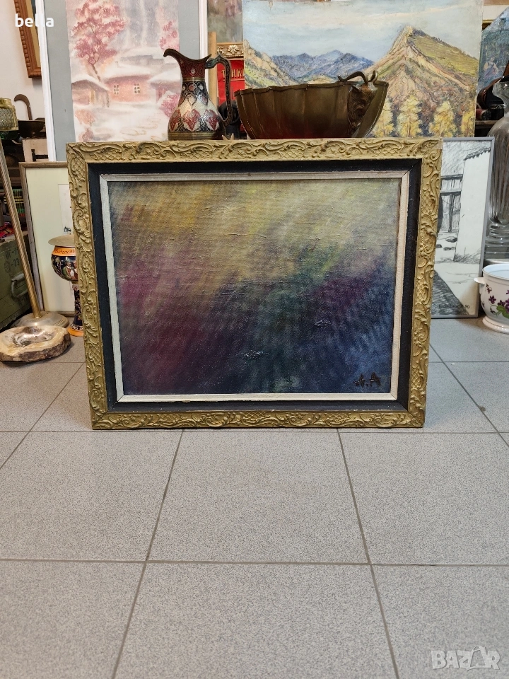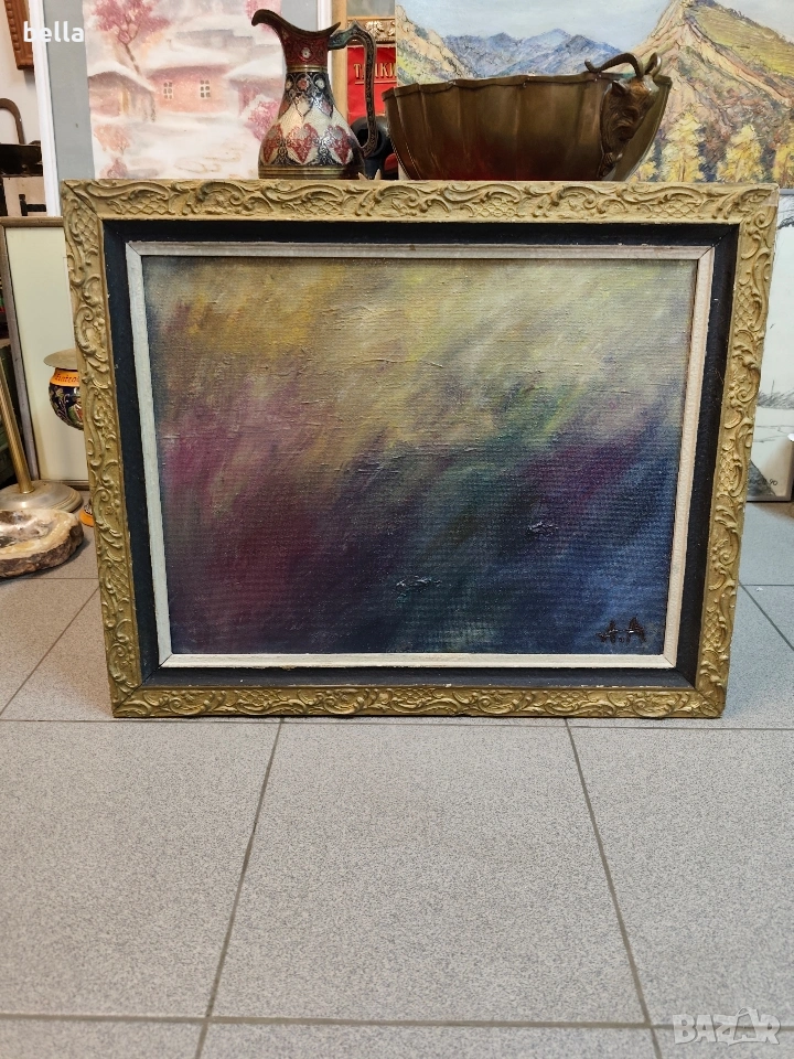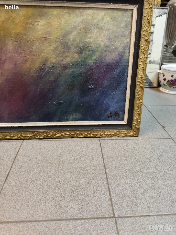 "Битка за Светлината“ – Авторска творба върху фазер Описание: Картина с мощно излъчване, символизираща триумфа на надеждата над ежедневните трудности. Използвана е техника на наслояване, която придава на произведението триизмерност. Съчетанието от тъмни, земни основи и ефирни, „небесни“ тонове горе създава баланс и мистика. Една картина с душа и история.Подписана А.А инициали и рамкирана,отзад на гърба е името на картината.Цена 250 евро